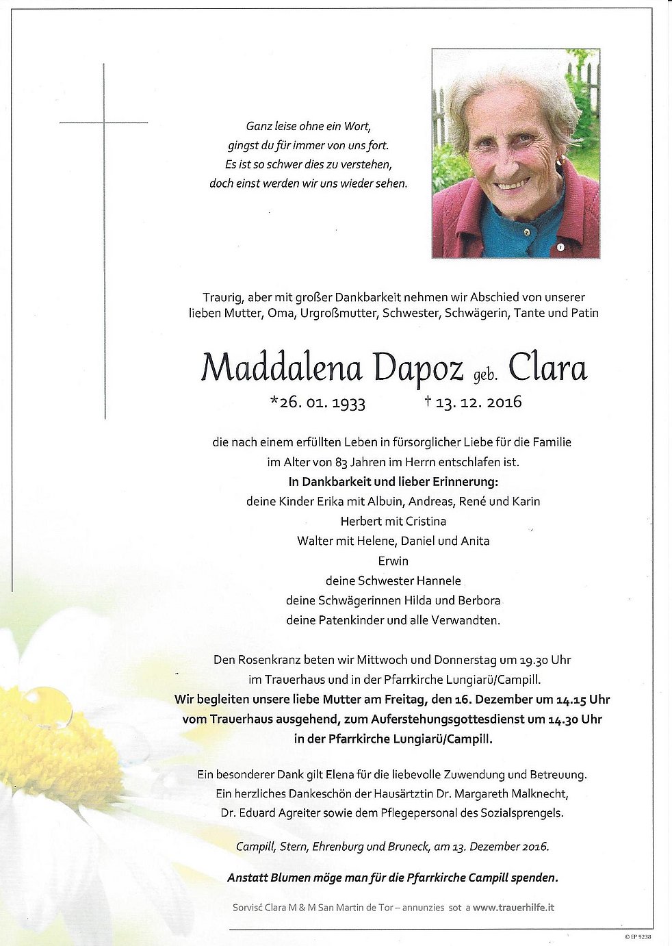 Wir begleiten unsere liebe Mutter am Freitag, den 16. Dezember um 14.15 Uhr vom Trauerhaus ausgehend, zum Auferstehungsgottesdienst um 14.30 Uhr in der Pfarrkirche Lungiarü/Campill.