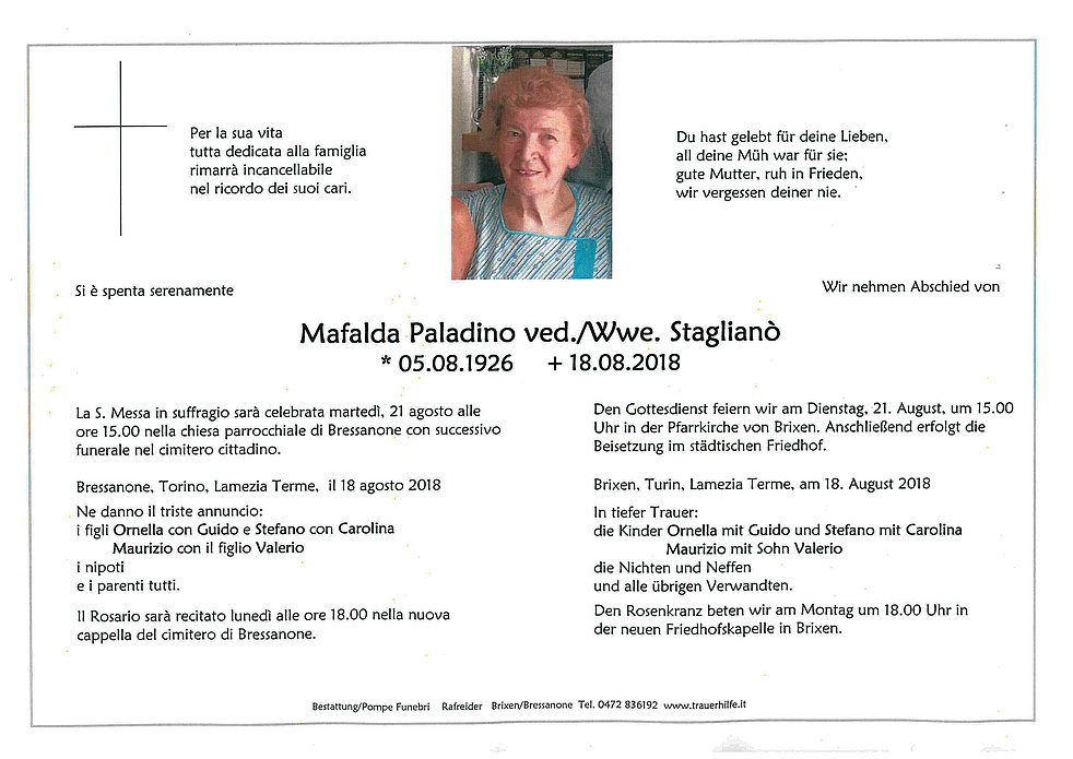 La S. Messa in suffragio sarà celebrata martedì, 21 agosto alle ore 15.00 nella chiesa parrocchiale di Bressanone con successivo funerale nel cimitero cittadino.