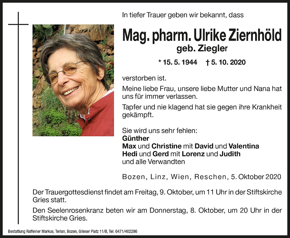 Der Trauergottesdienst findet am Freitag, 9. Oktober, um 11 Uhr in der Stiftskirche Gries statt.