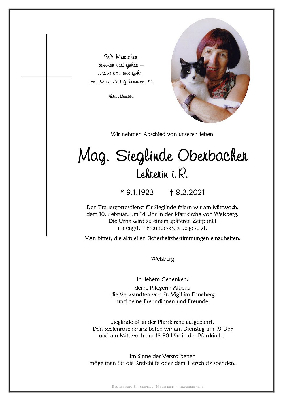 Den Trauergottesdienst für Sieglinde feiern wir am Mittwoch, dem 10. Februar, um 14 Uhr in der Pfarrkirche von Welsberg.