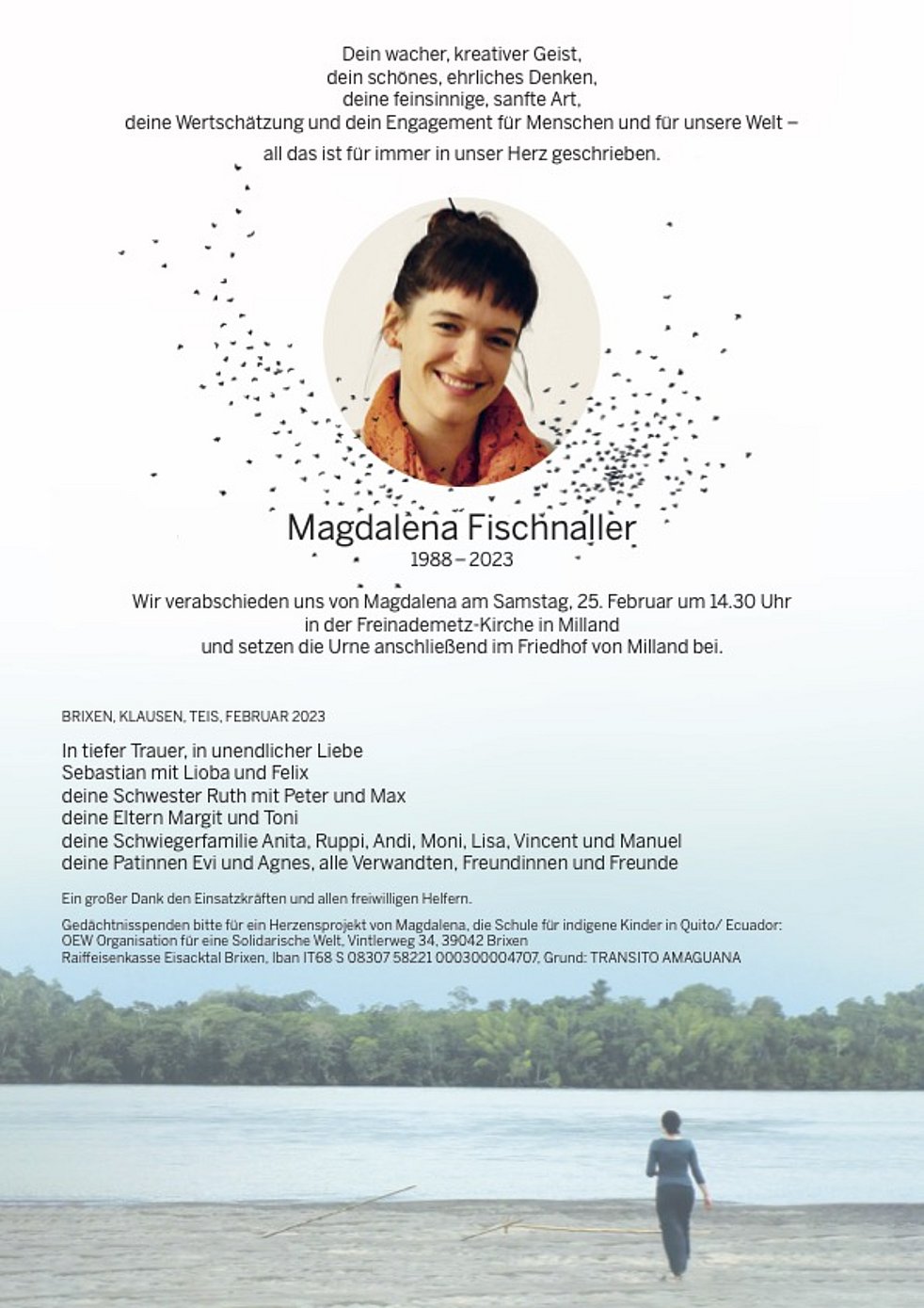 Lieber Sebastian, liebe Familie Fischnaller, " und meine Seele spannte weit ihre Flügel aus, und flog durch die stillen Lande, als flöge sie nach Haus" Eure liebe Magdalena ist nun im Licht und der Liebe Gottes von wo sie euch liebevoll begleiten wird. Euch allen wünschen wir Kraft und Trost für diese schwere Zeit. Viele gute Freunde die euch beistehen und unterstützen. Unsere Gedanken sind bei euch. Aufrichtiges Mitgefühl Brigitte und Peter