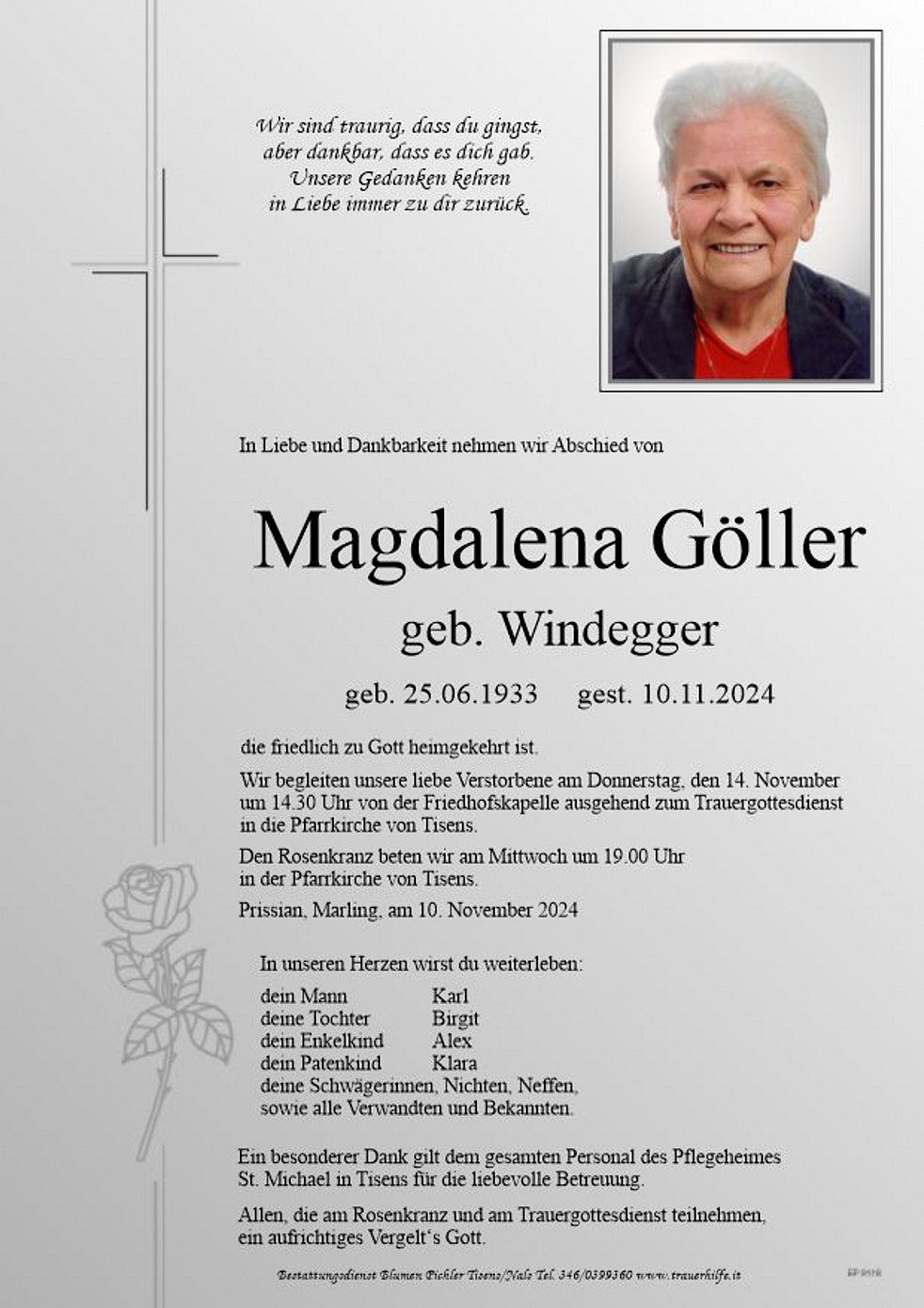Begräbnisgottesdienst: 14.11. - 14:30 Uhr Pfarrkirche Tisens