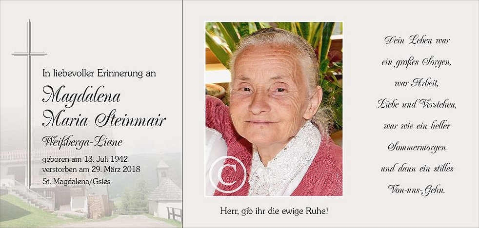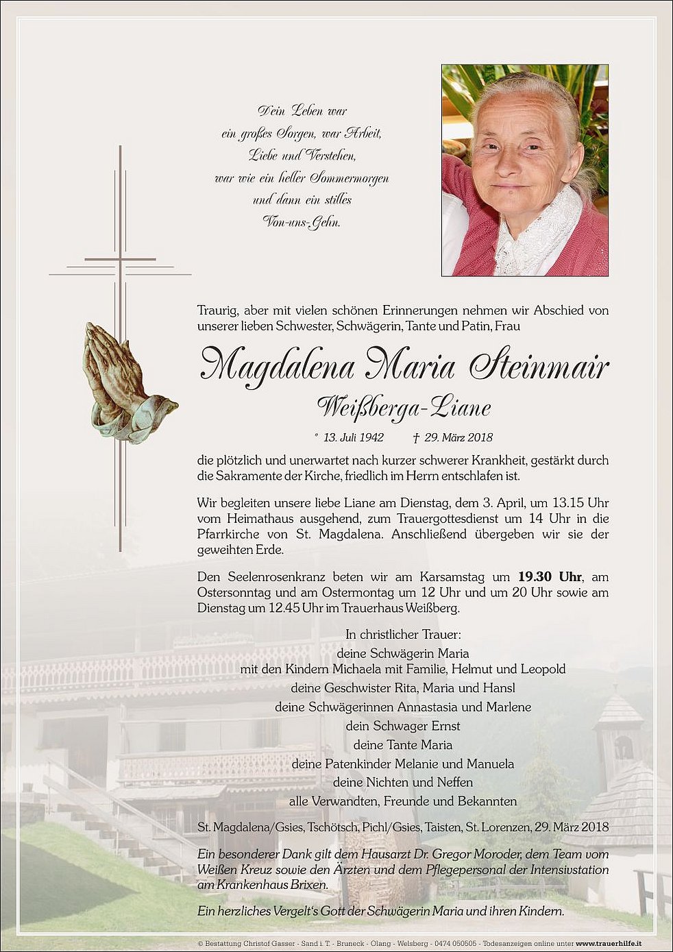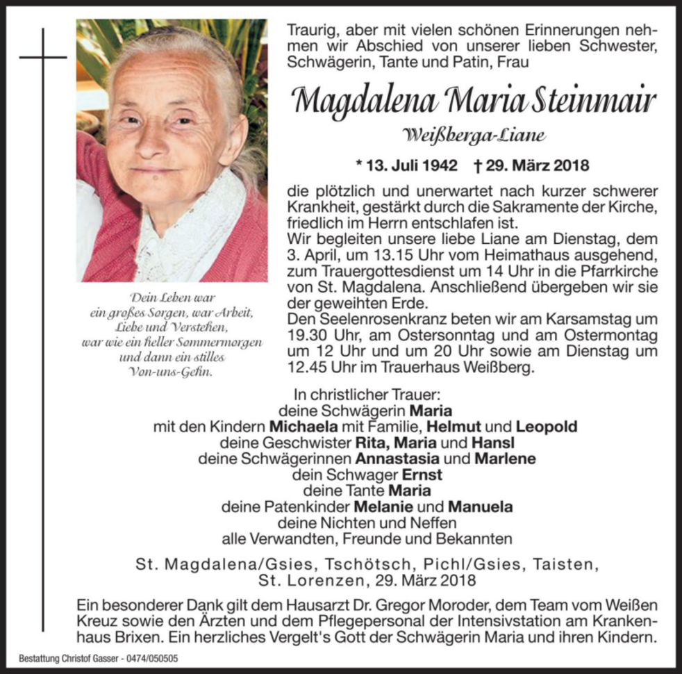 Wir begleiten unsere liebe Liane am Dienstag, dem 3. April, um 13.15 Uhr vom Heimathaus ausgehend, zum Trauergottesdienst um 14 Uhr in die Pfarrkirche von St. Magdalena. Anschließend übergeben wir sie der geweihten Erde.