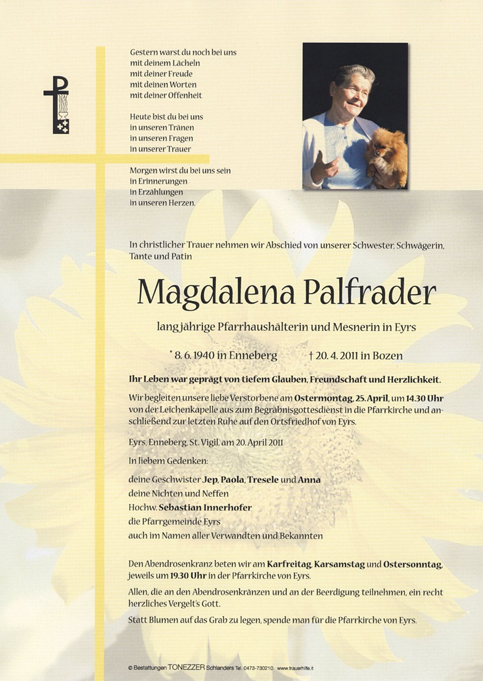 Wir begleiten unsere liebe Verstorbene am Ostermontag, 25. April, um 14.30 Uhr von der Leichenkapelle aus zum Begräbnisgottesdienst in die Pfarrkirche und anschließend zur letzten Ruhe auf den Ortsfriedhof von Eyrs.