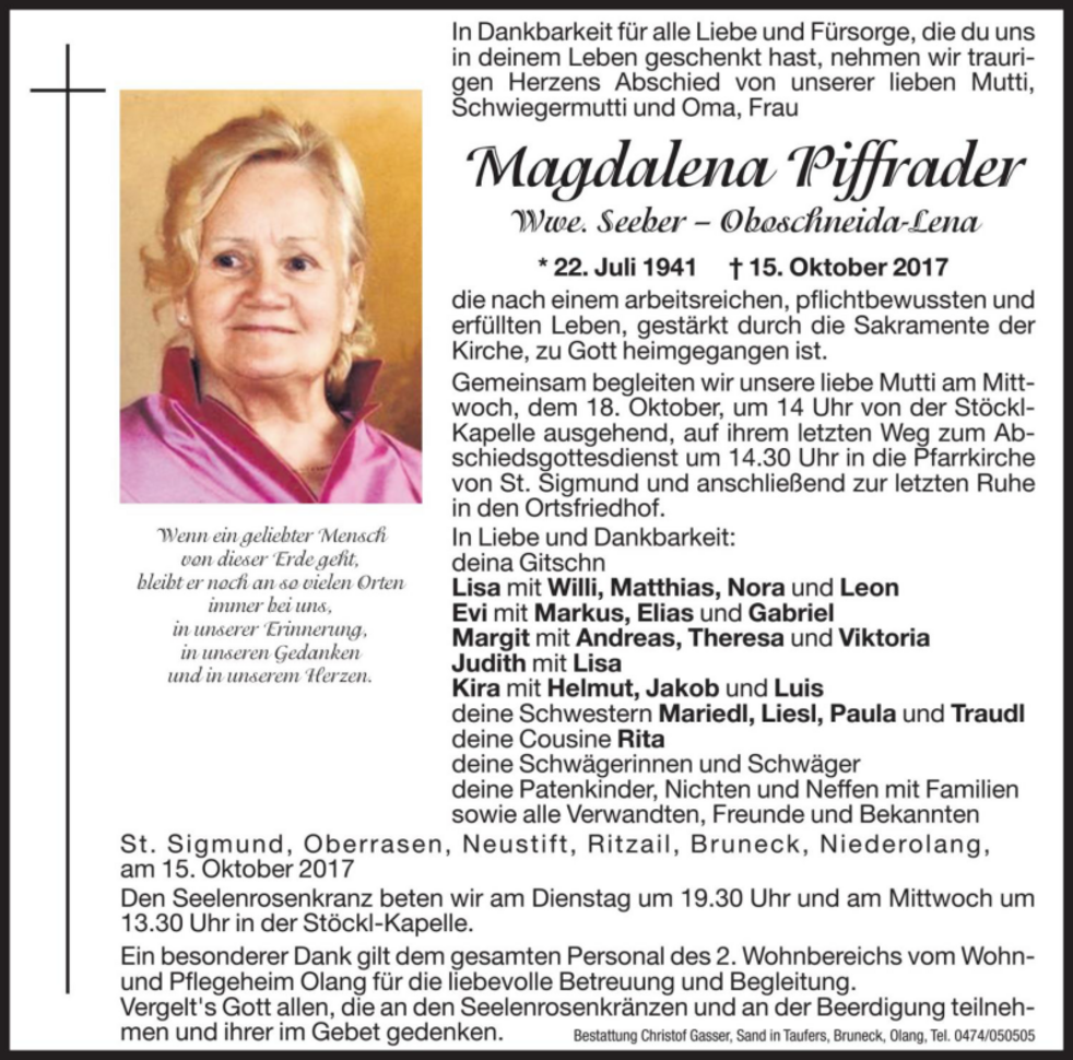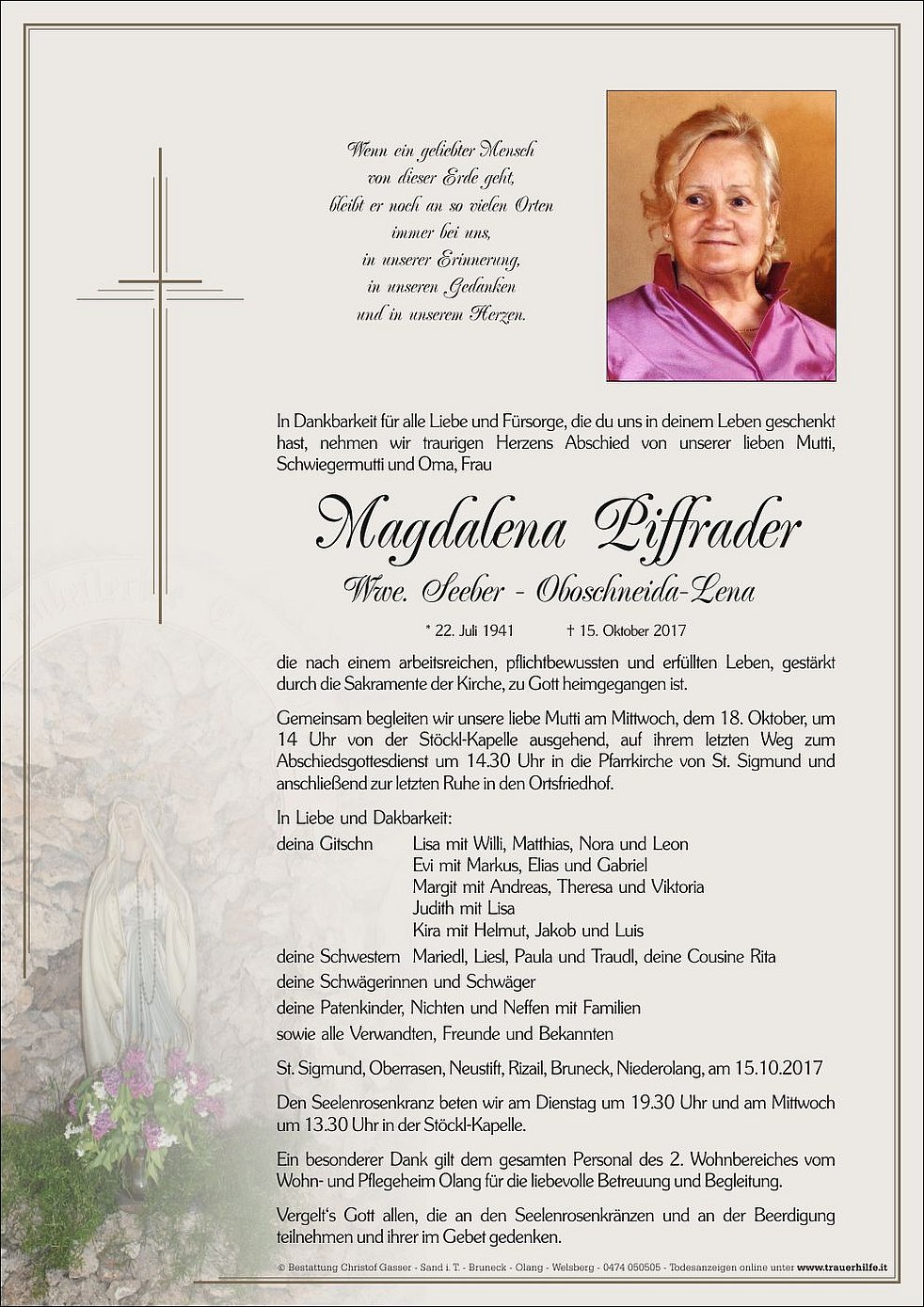 Gemeinsam begleiten wir unsere liebe Mutti am Mittwoch, dem 18. Oktober, um 14 Uhr von der Stöckl-Kapelle ausgehend, auf ihrem letzten Weg zum Abschiedsgottesdienst um 14.30 Uhr in die Pfarrkirche von St. Sigmund und anschließend zur letzten Ruhe in den Ortsfriedhof.