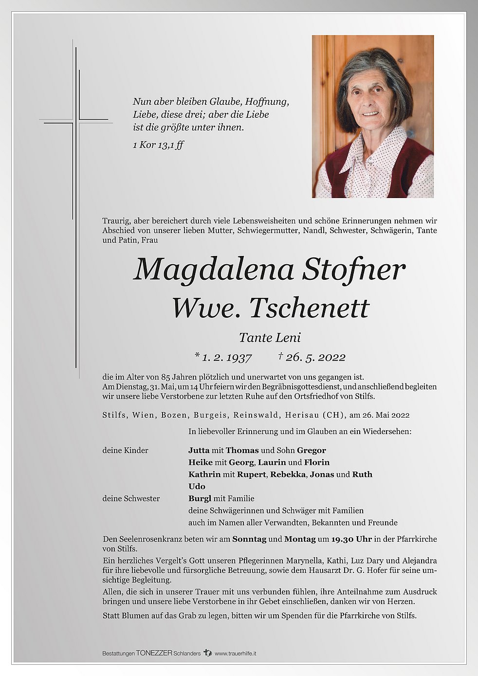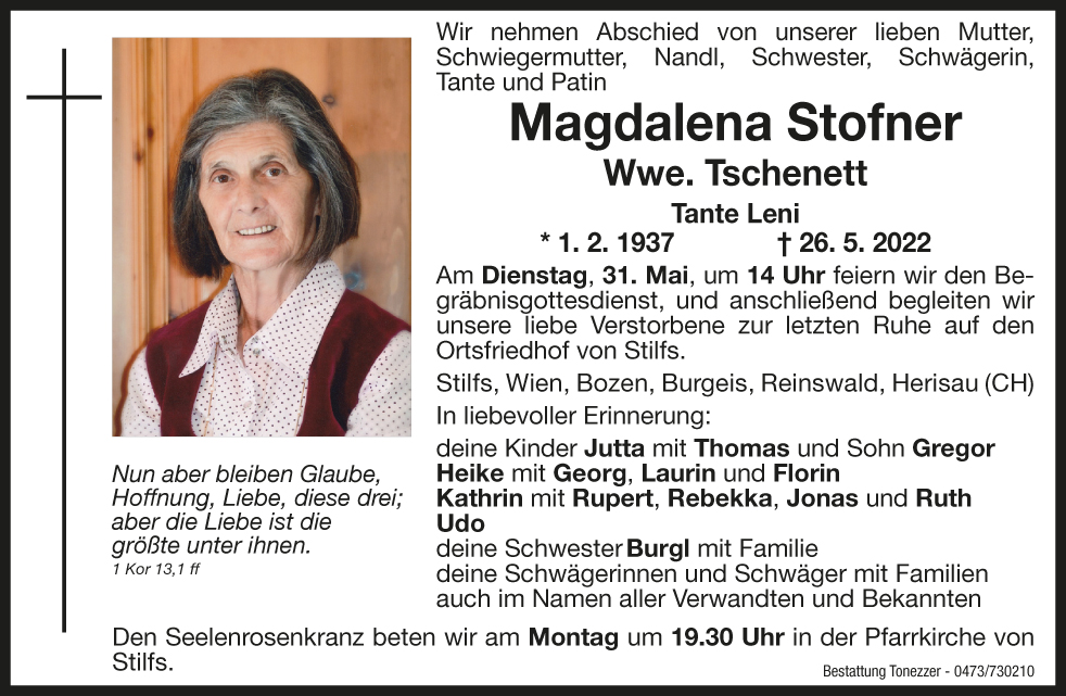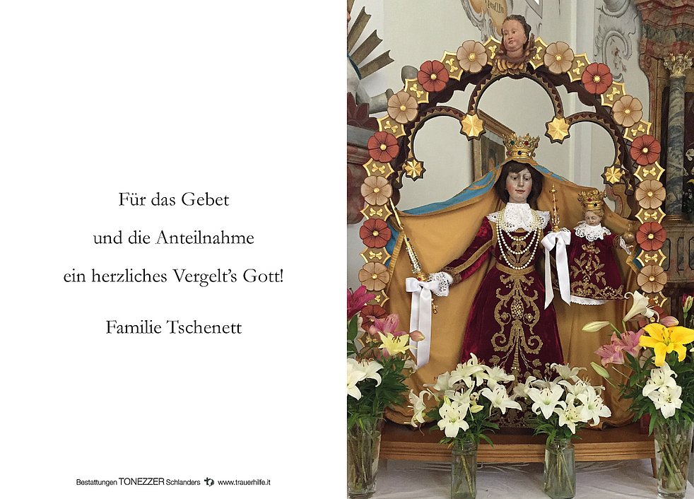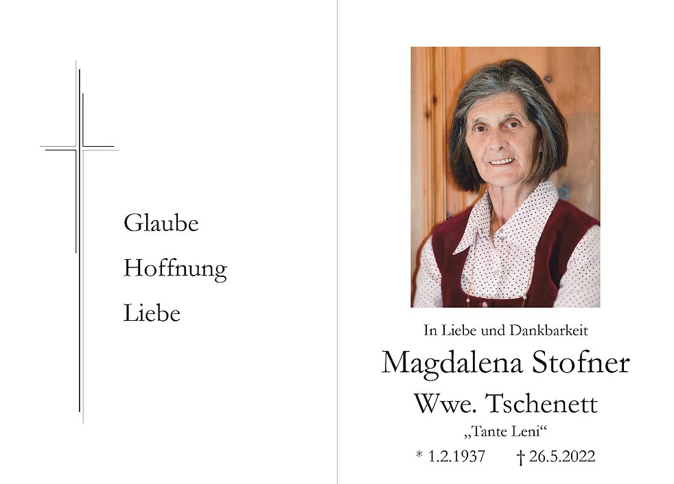 Am Dienstag, 31. Mai, um 14 Uhr feiern wir den Begräbnisgottesdienst, und anschließend begleiten wir unsere liebe Verstorbene zur letzten Ruhe auf den Ortsfriedhof von Stilfs.