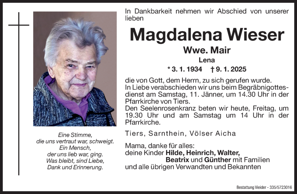 In Liebe verabschieden wir uns beim Begräbnisgottesdienst am Samstag, 11. Jänner, um 14.30 Uhr in der Pfarrkirche von Tiers.