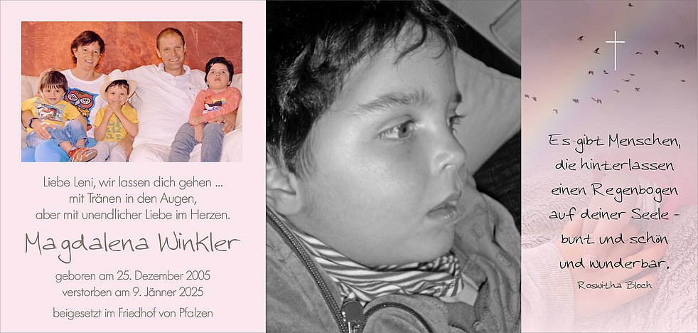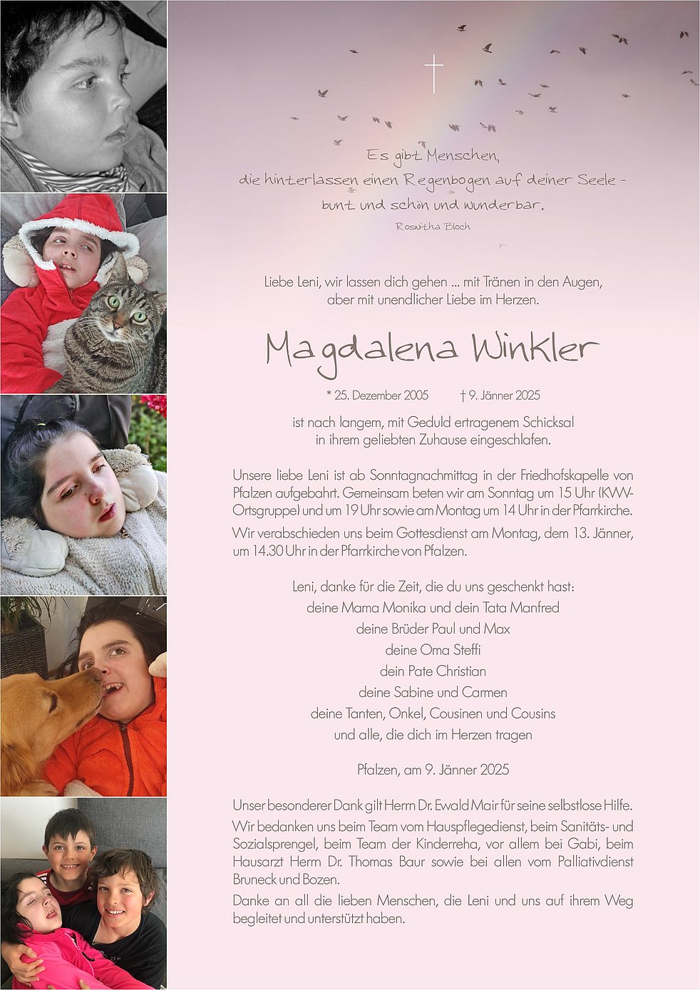 Wir bedanken uns beim Team vom Hauspflegedienst, beim Sanitäts- und Sozialsprengel, beim Team der Kinderreha, vor allem bei Gabi, beim Hausarzt Herrn Dr. Thomas Baur sowie bei allen vom Palliativdienst Bruneck und Bozen.