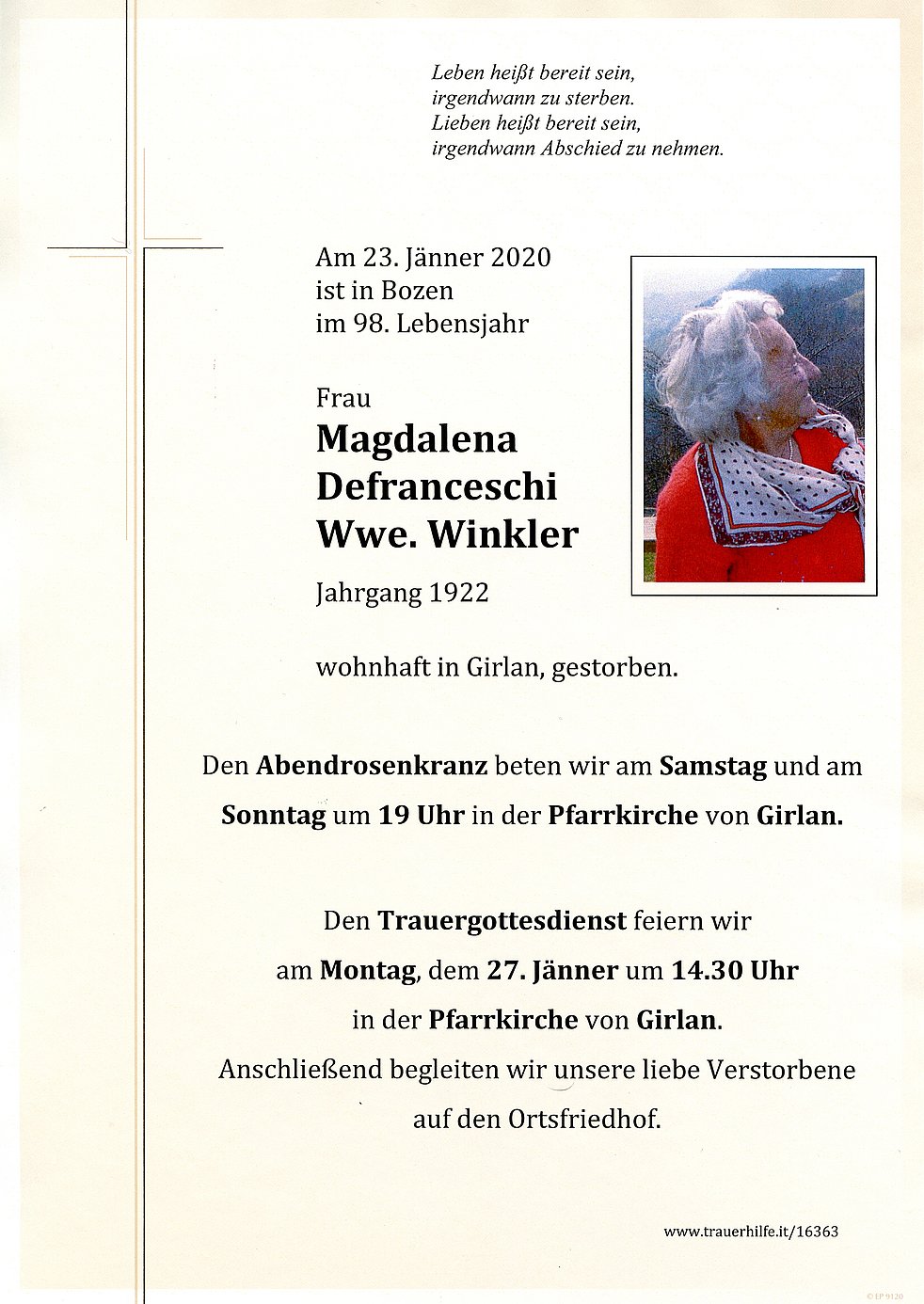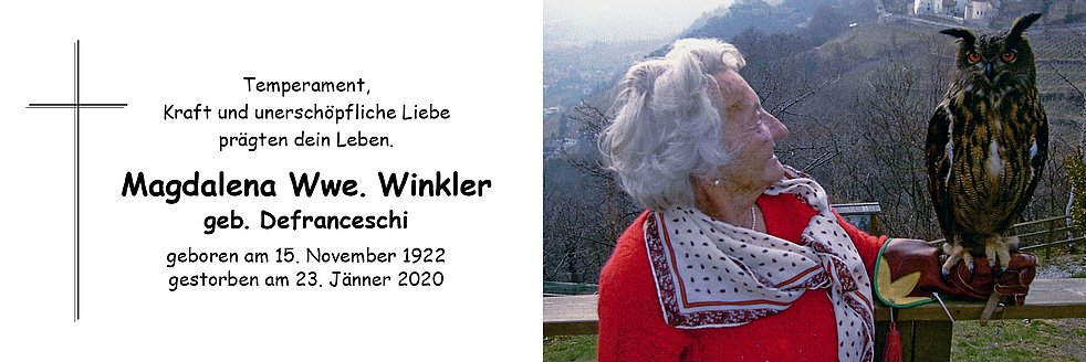 Den Trauergottesdienst feiern wir am Montag, dem 27. Jänner um 14.30 Uhr in der Pfarrkirche von Girlan. Anschließend begleiten wir unsere liebe Verstorbene auf den Ortsfriedhof.