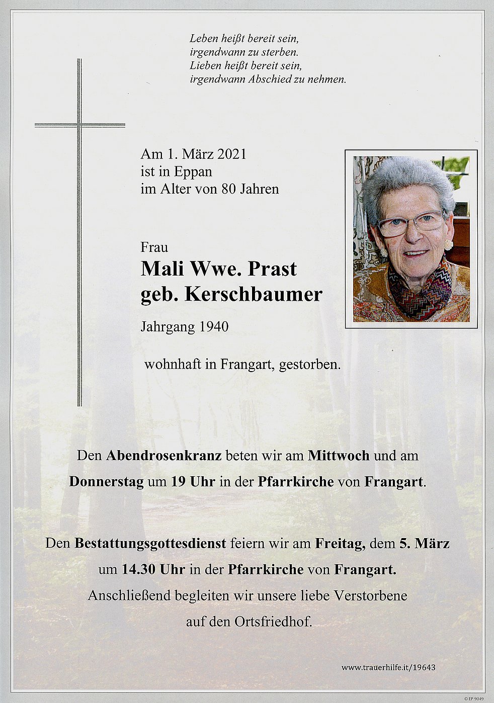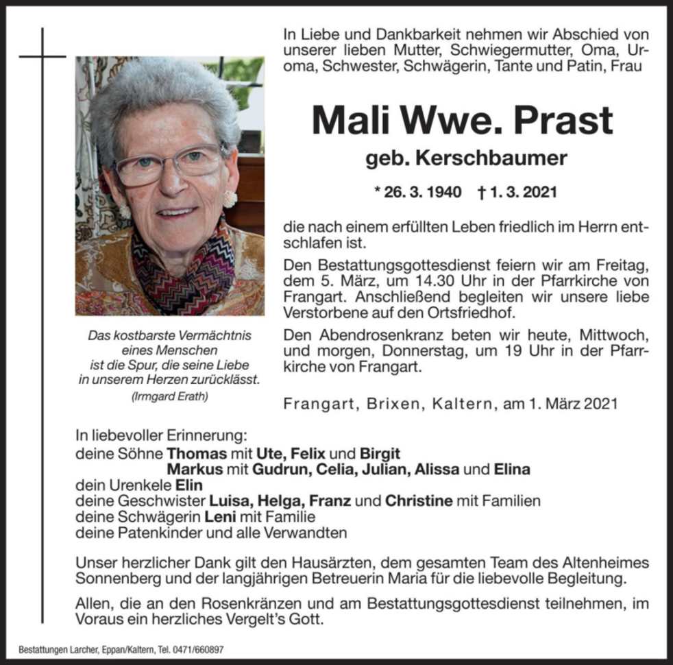 Den Bestattungsgottesdienst feiern wir am Freitag, dem 5. März um 14.30 Uhr in der Pfarrkirche von Frangart. Anschließend begleiten wir unsere liebe Verstorbene auf den Ortsfriedhof.