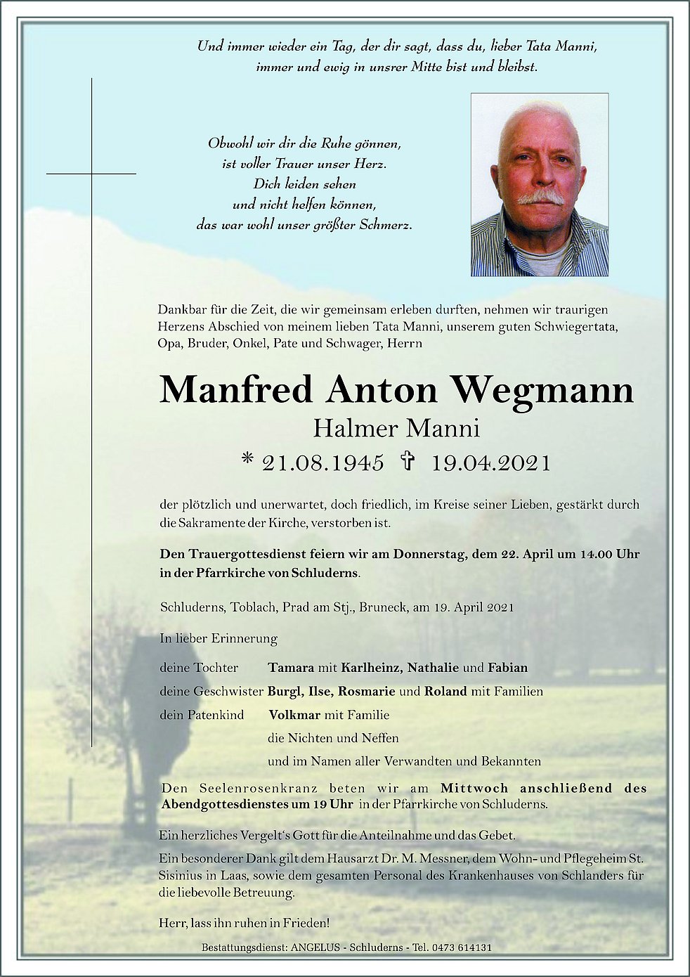 Den Trauergottesdienst feiern wir am Donnerstag, dem 22. April um 14.00 Uhr in der Pfarrkirche von Schluderns.