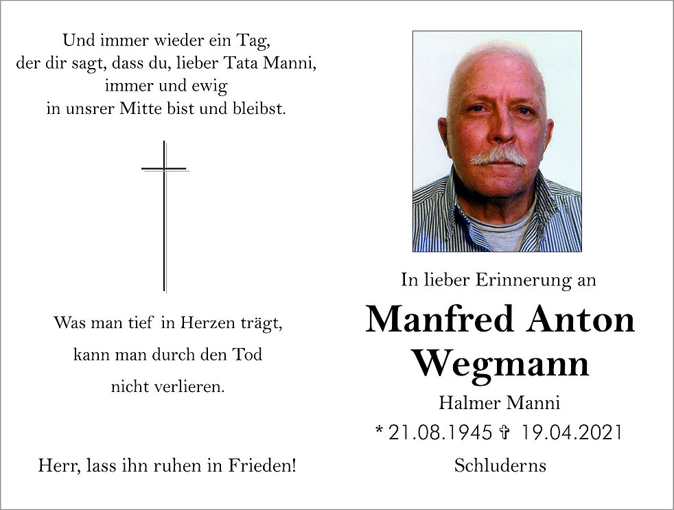 Dankbar für die Zeit, die wir gemeinsam erleben durften, nehmen wir traurigen Herzens Abschied von meinem lieben Tata Manni, unserem guten Schwiegertata, Opa, Bruder, Onkel, Pate und Schwager, Herrn