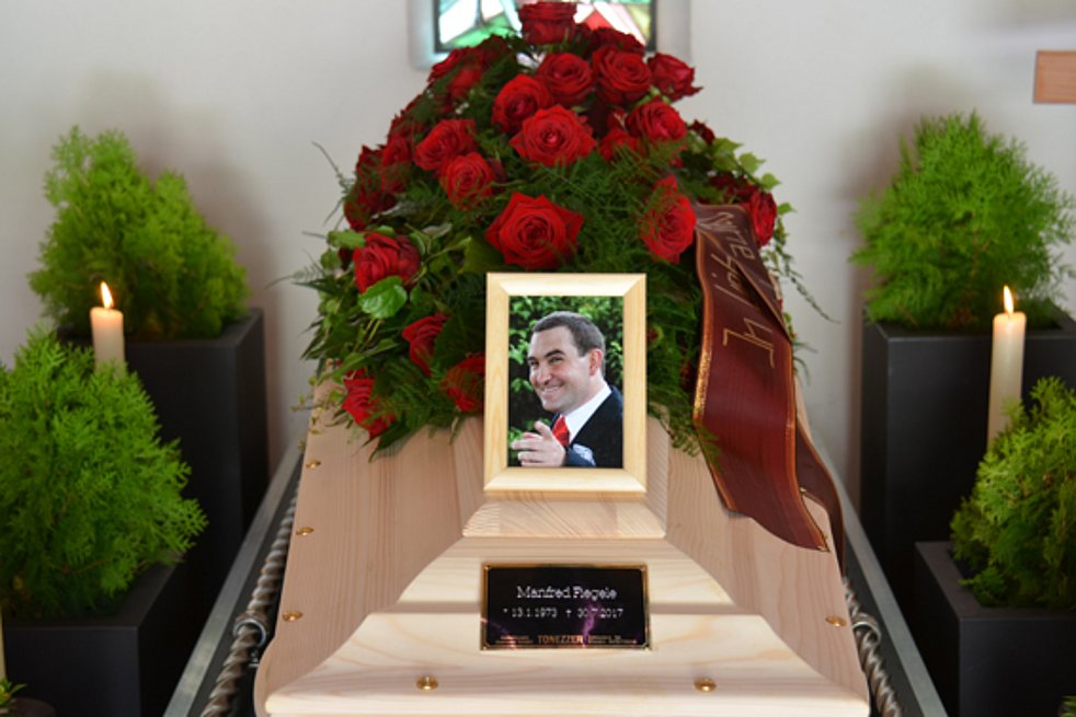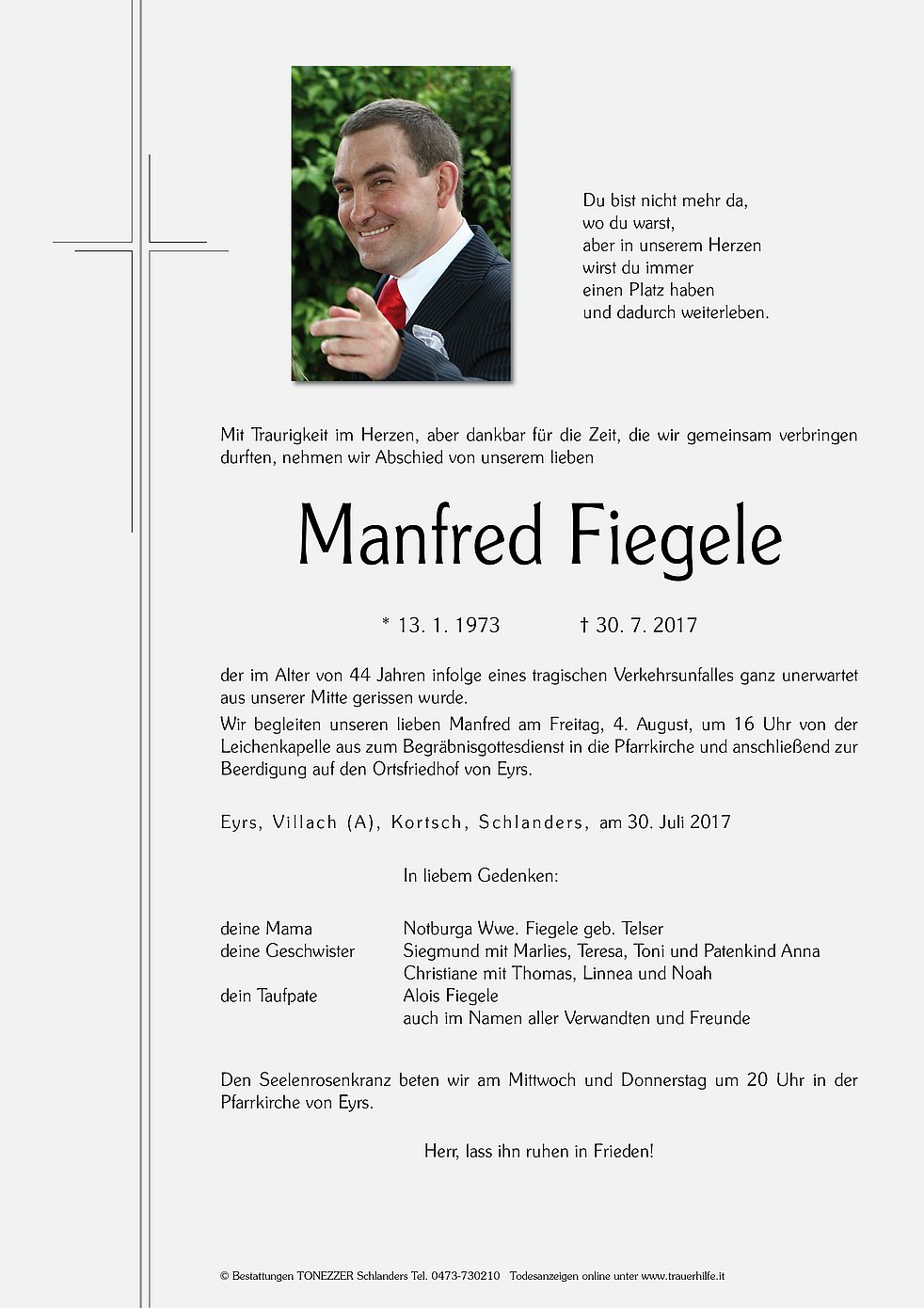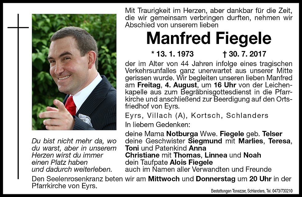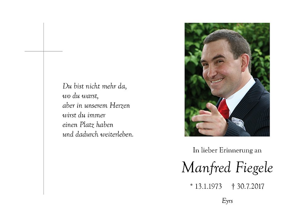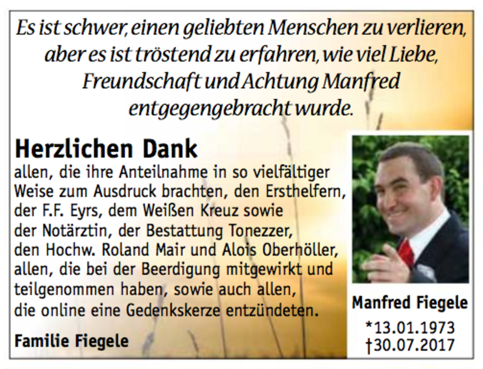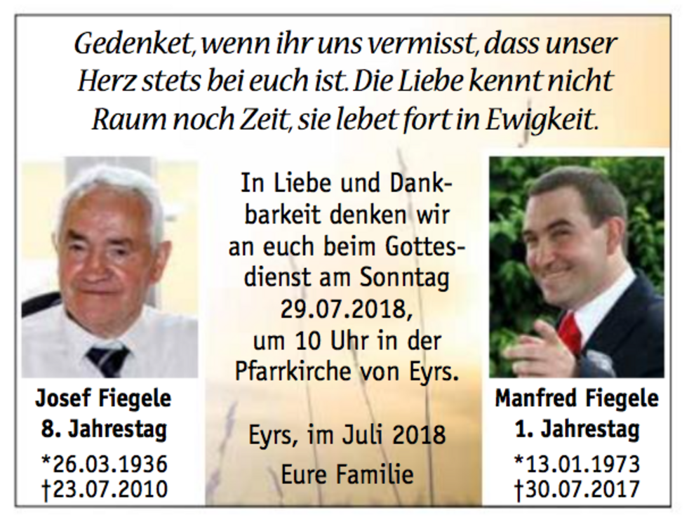 Wir begleiten unseren lieben Manfred am Freitag, 4. August, um 16 Uhr vom der Leichenkapelle aus zum Begräbnisgottesdienst in die Pfarrkirche und anschließend zur Beerdigung auf den Ortsfriedhof von Eyrs.