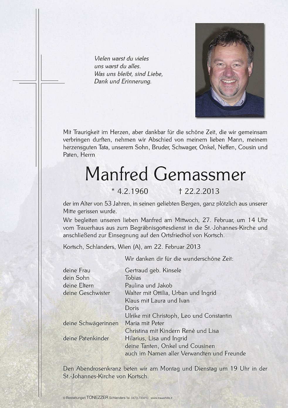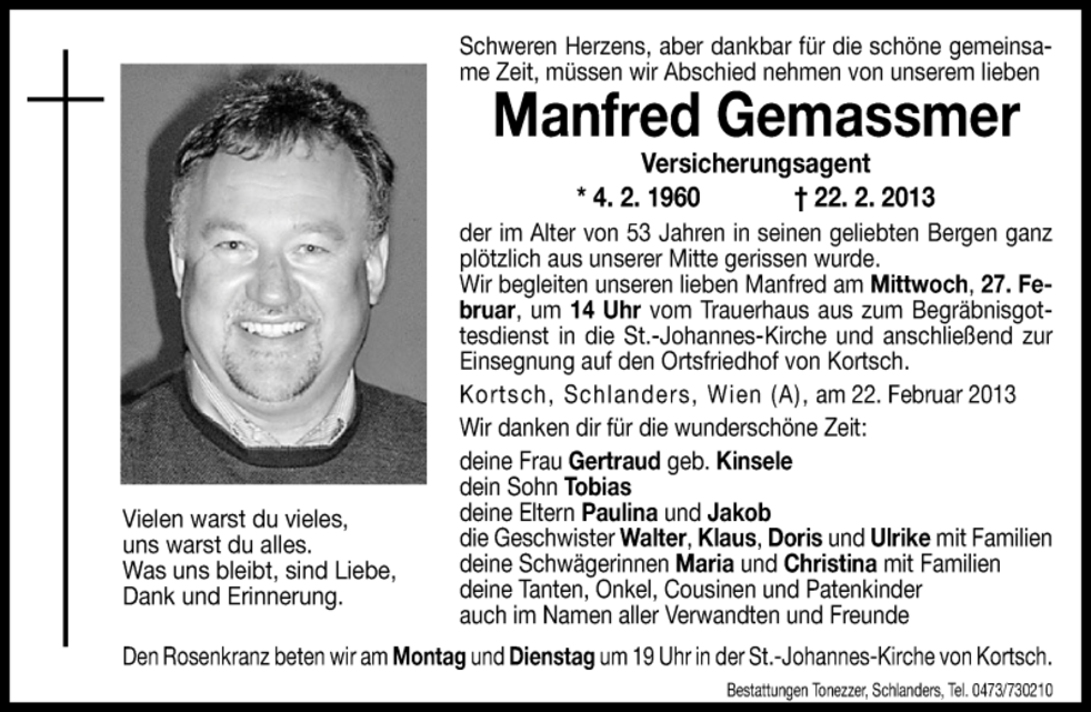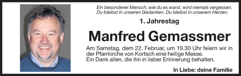 Wir begleiten unseren lieben Manfred am Mittwoch, 27. Februar, um 14 Uhr vom Trauerhaus aus zum Begräbnisgottesdienst in die St.-Johannes-Kirche und anschließend zur Einsegnung auf den Ortsfriedhof von Kortsch.