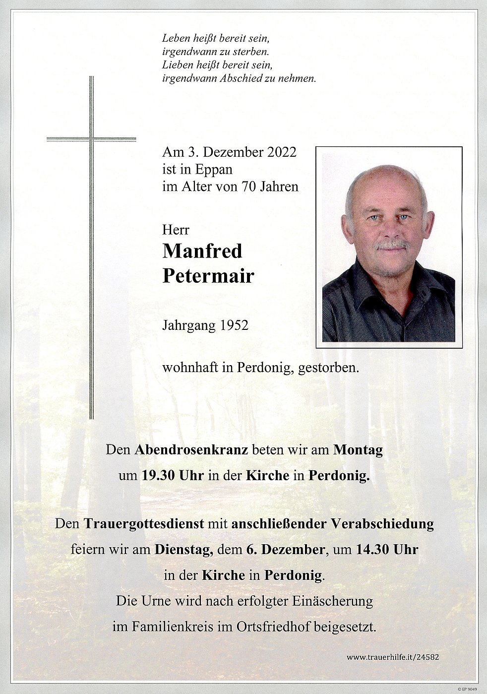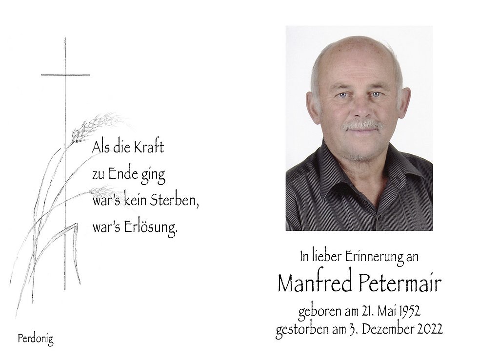 Im Sinne des Verstorbenen möge man für die Restaurierung des Kirchturms von Perdonig (IBAN: IT66 U082 5558 1610 0030 1000 039) spenden.