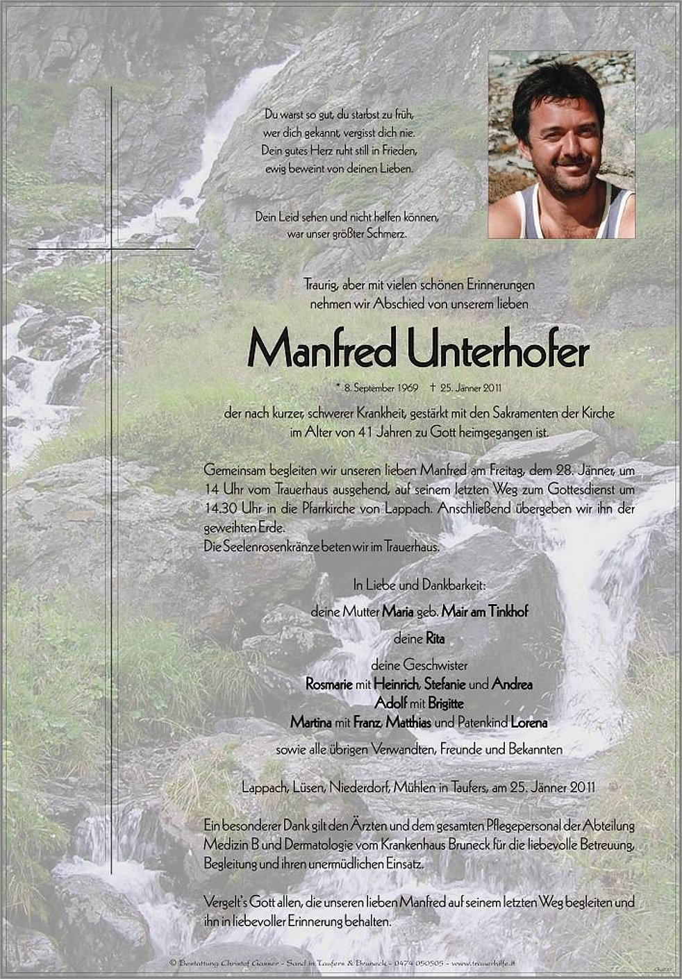 14 Uhr vom Trauerhaus ausgehend, auf seinem letzten Weg zum Gottesdienst um 14.30 Uhr in die Pfarrkirche von Lappach. Anschließend übergeben wir ihn der geweihten Erde.