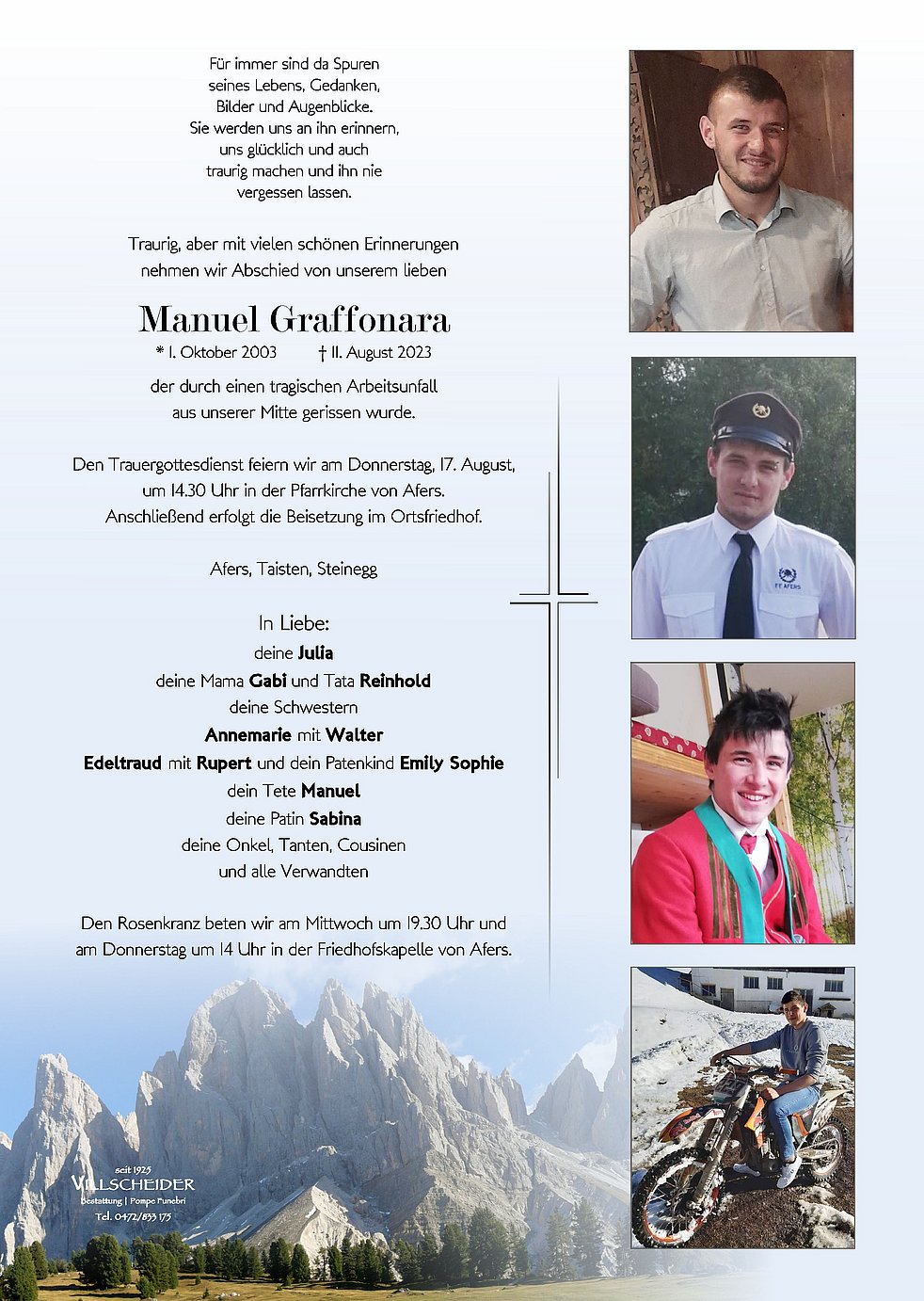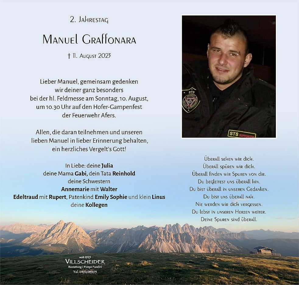 Lieber Reinhold ,liebe Familie wir drücken euch unser tiefempfundenes Beileid aus und wünschen Euch viel Kraft. Obwohl Manuel nicht mehr unter uns ist,ist er uns trotzdem sehr nah.