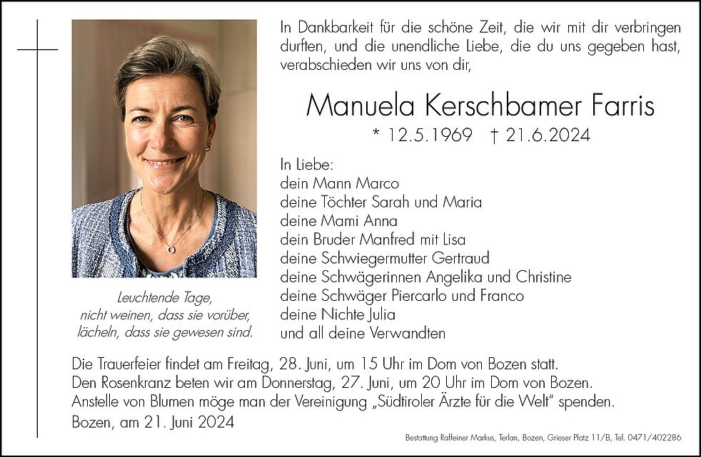Anstelle von Blumen möge man der Vereinigung „Südtiroler Ärzte für die Welt“ spenden.