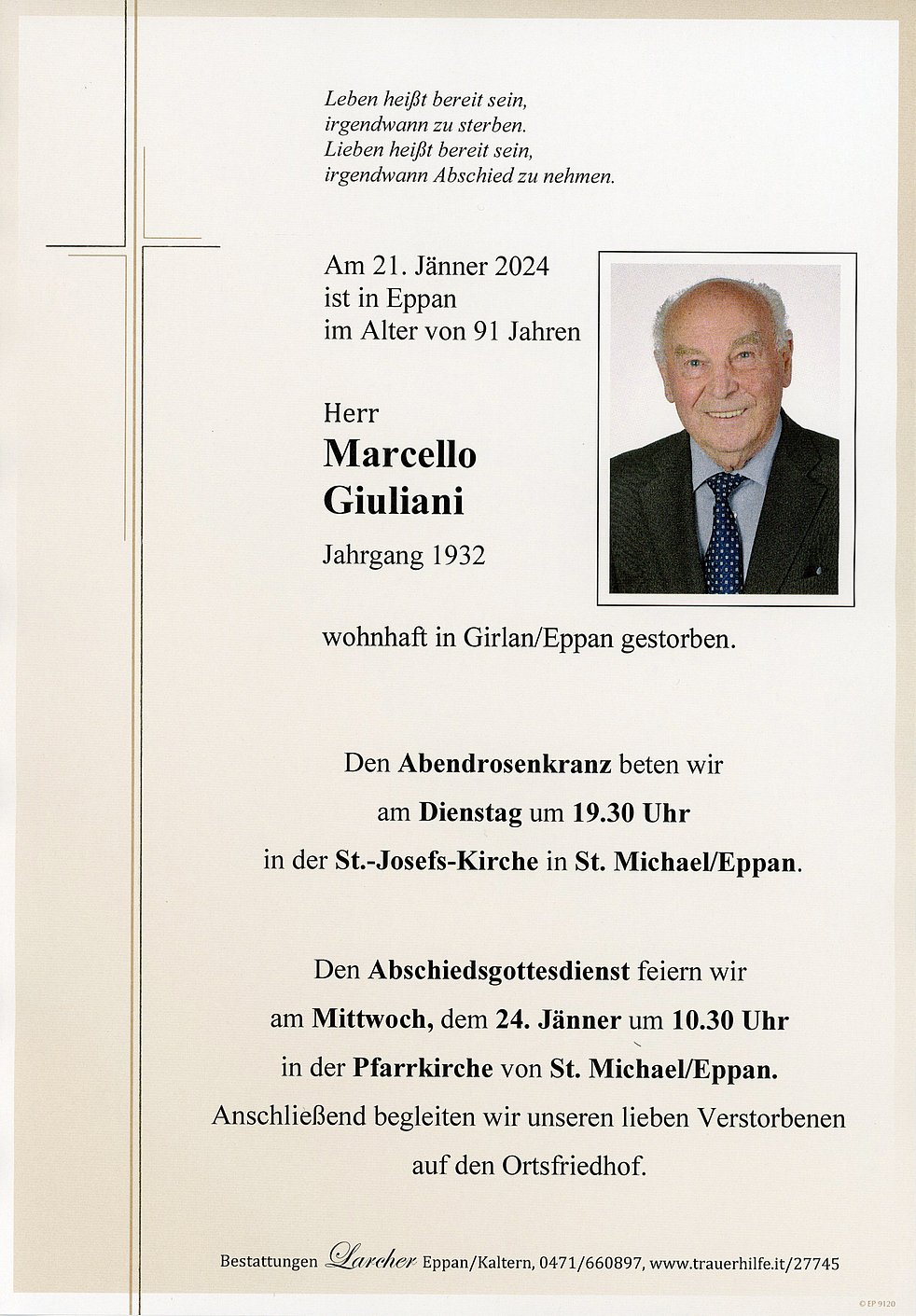 Den Abschiedsgottesdienst feiern wir am Mittwoch, dem 24. Jänner um 10.30 Uhr in der Pfarrkirche von St. Michael Eppan. Anschließend begleiten wir unseren lieben Verstorbenen auf den Ortsfriedhof.