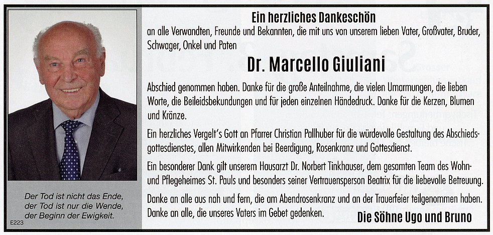 Wir danken dem Hausarzt Dr. Norbert Tinkhauser und dem gesamten Team des Wohn- und Pflegeheimes St. Pauls, besonders seiner Vertrauensperson Beatrix für die liebevolle Betreuung.