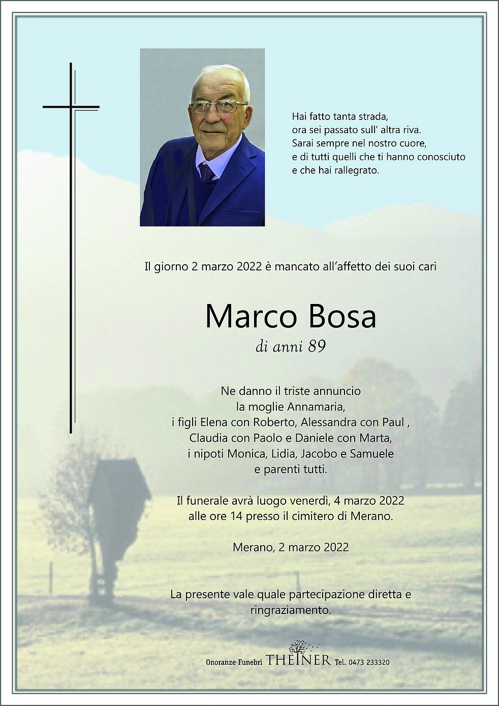 Il funerale avrà luogo venerdì, 4 marzo 2022 alle ore 14 presso il cimitero di Merano