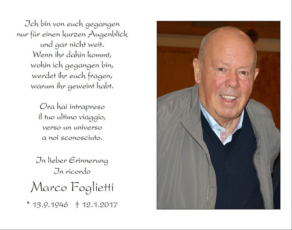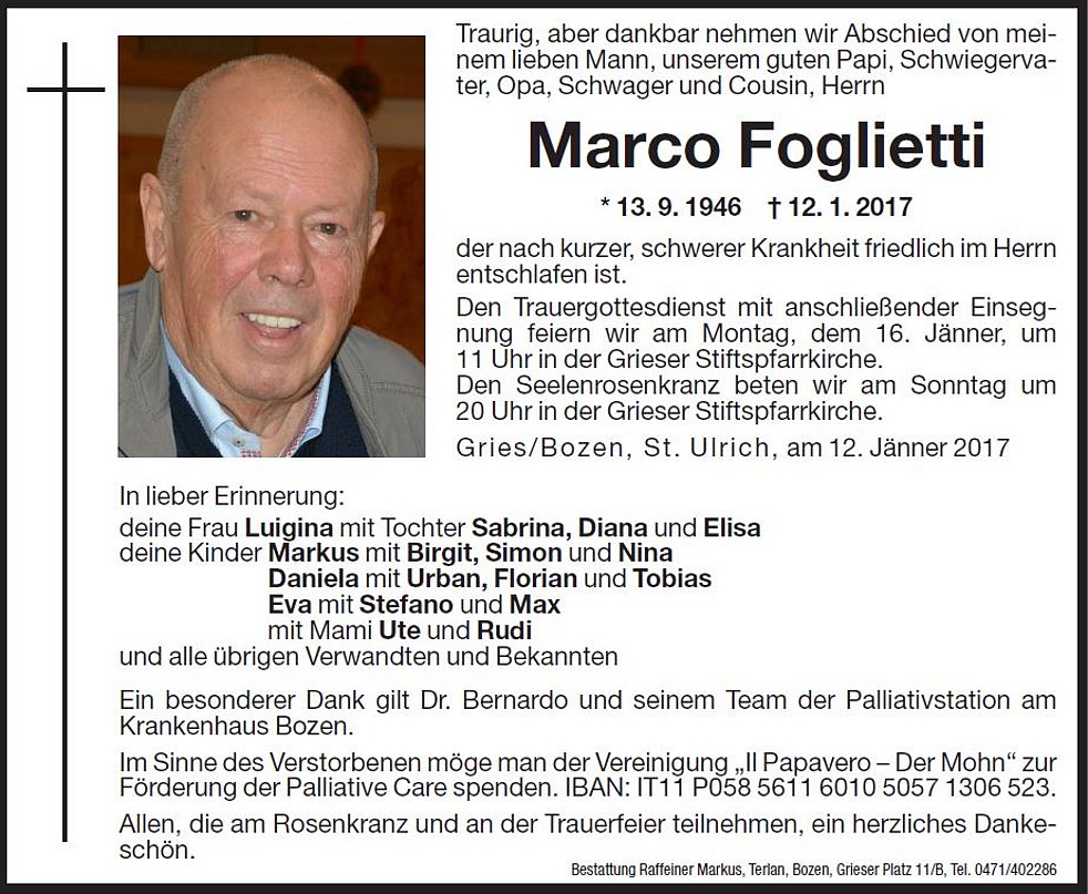 Im Sinne des Verstorbenen möge man der Vereinigung Il Papavero-Der Mohn, zur Förderung der Palliativ Care spenden. IBAN: IT11 P058 5611 6010 5057 1306 523