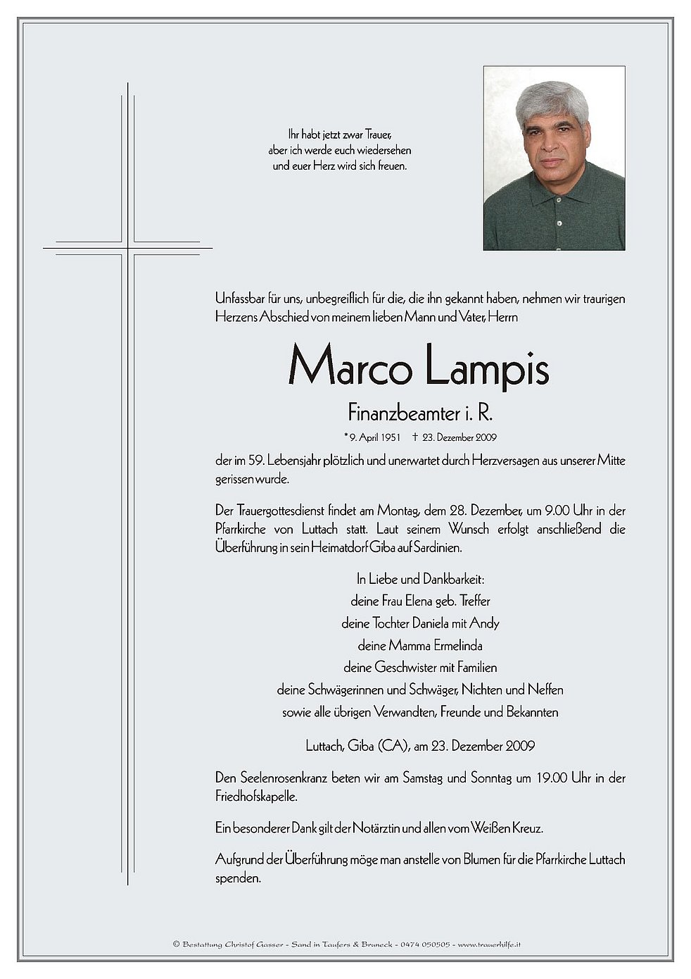 Der Trauergottesdienst findet am Montag, dem 28. Dezember, um 9.00 Uhr in der Pfarrkirche von Luttach statt. Laut seinem Wunsch erfolgt anschließend die Überführung in sein Heimatdorf Giba auf Sardinien.