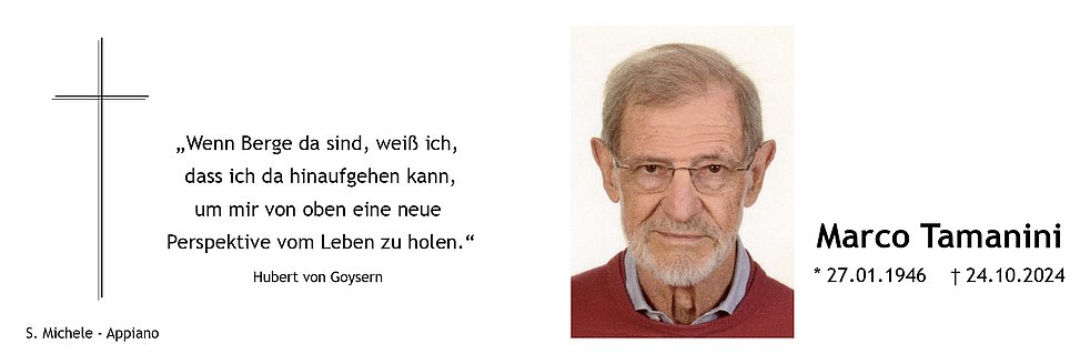 Ne danno il triste annuncio la tua moglie Annie nata Marseiler, le sorelle Rosanna con Anton Giulio, Maxi con † Roberto, Cristina con Enrico, i tuoi amati nipoti Cornelia con Norberto, Camilla con Claudio, Gowinda, Manolo, Ruti, David, Palti, Isabel con Jisan, Christof con Helga, i pronipoti Giacomo, Matilde, Sara, Gil, Or, Gali, Shira, Jarden, Eitan, Amit, Zahira, Elias, Mati, Jana. Gli amici, in particolare Giuliano, sciatori e alpinisti, in particolare Manlio i parenti e conoscenti.
