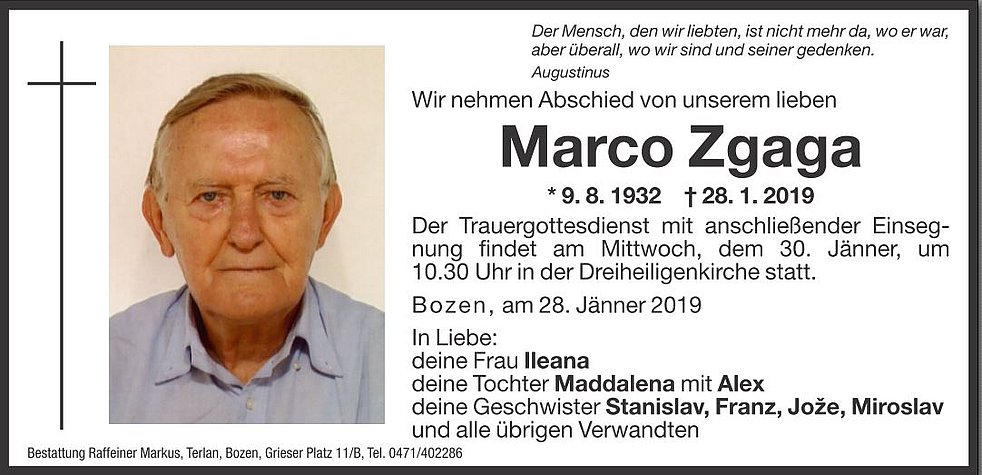 Lo annunciano la moglie Ileana, la figlia Maddalena con Alex, i fratelli Stanislav, Franz, Jože, Miroslav e tutti i parenti.