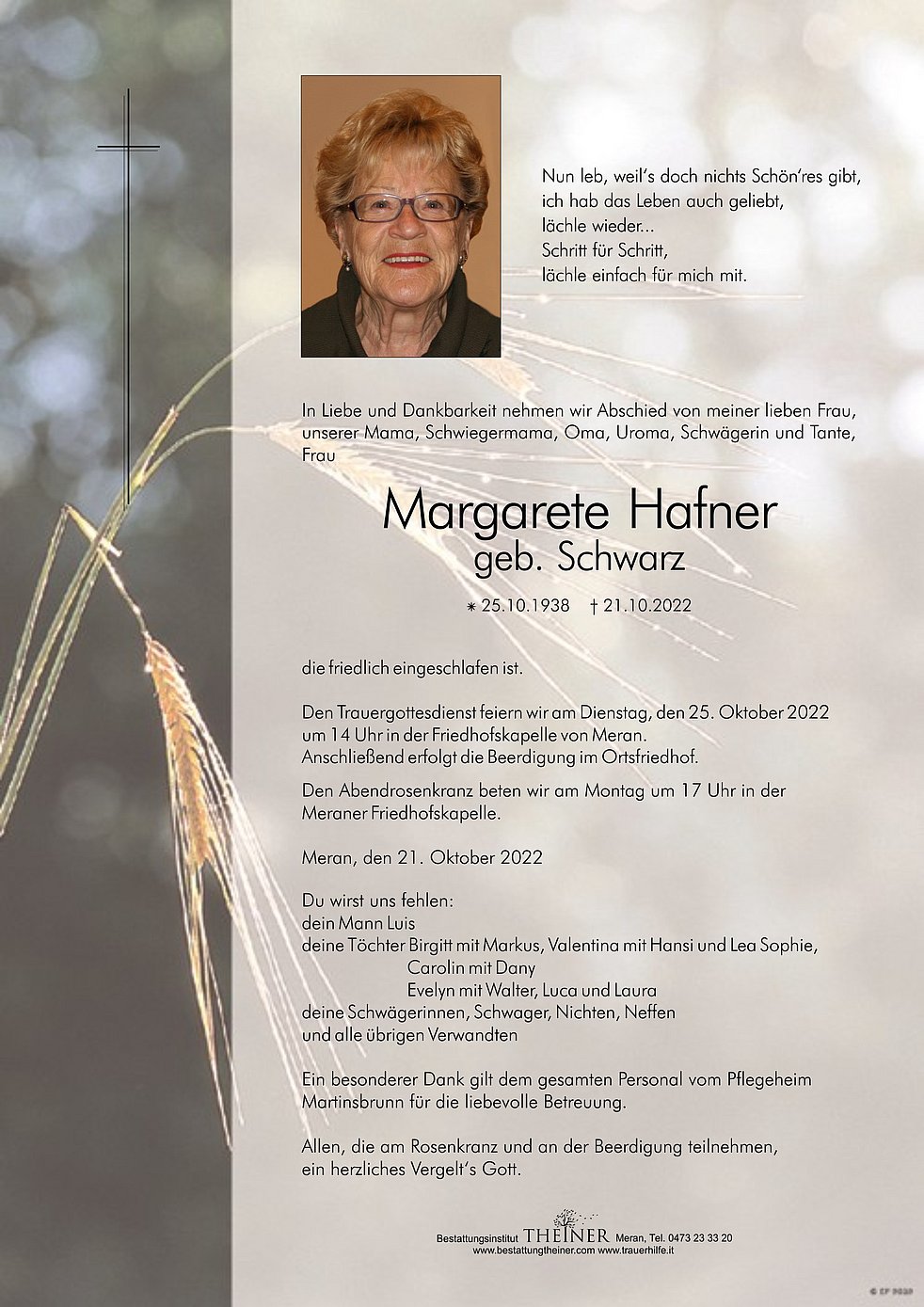Den Trauergottesdienst feiern wir am Dienstag, den 25. Oktober 2022 um 14 Uhr in der Friedhofskapelle von Meran.