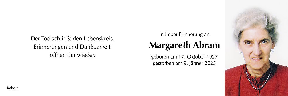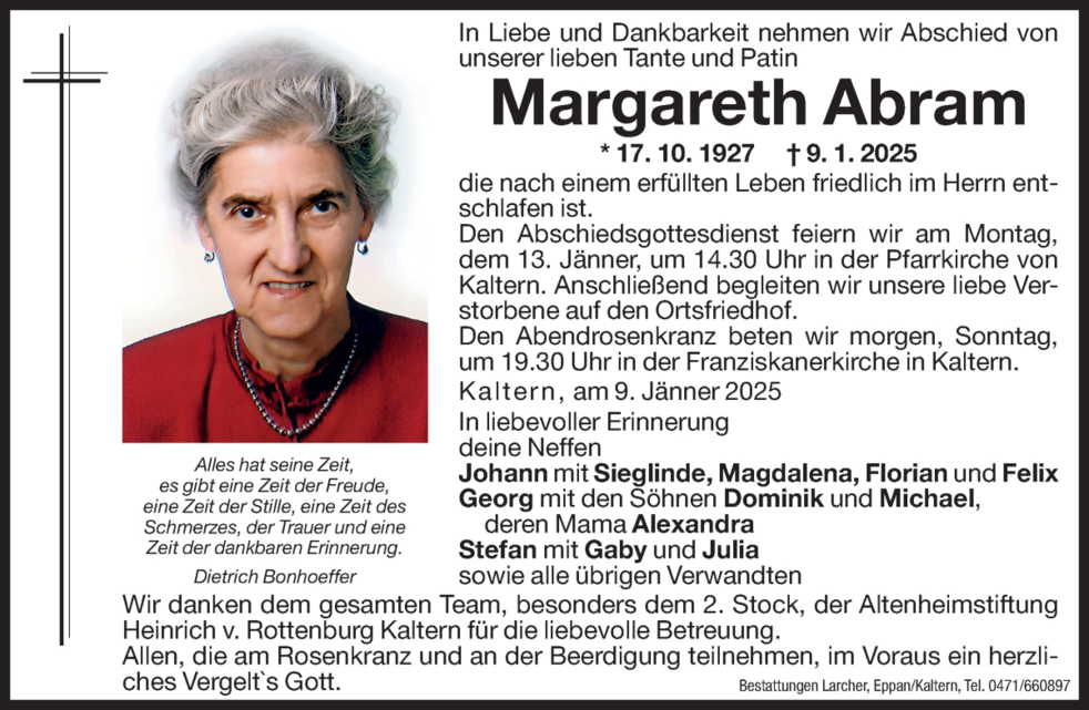 Den Abschiedsgottesdienst feiern wir am Montag, dem 13. Jänner um 14.30 Uhr in der Pfarrkirche von Kaltern. Anschließend begleiten wir unsere liebe Verstorbene auf den Ortsfriedhof.