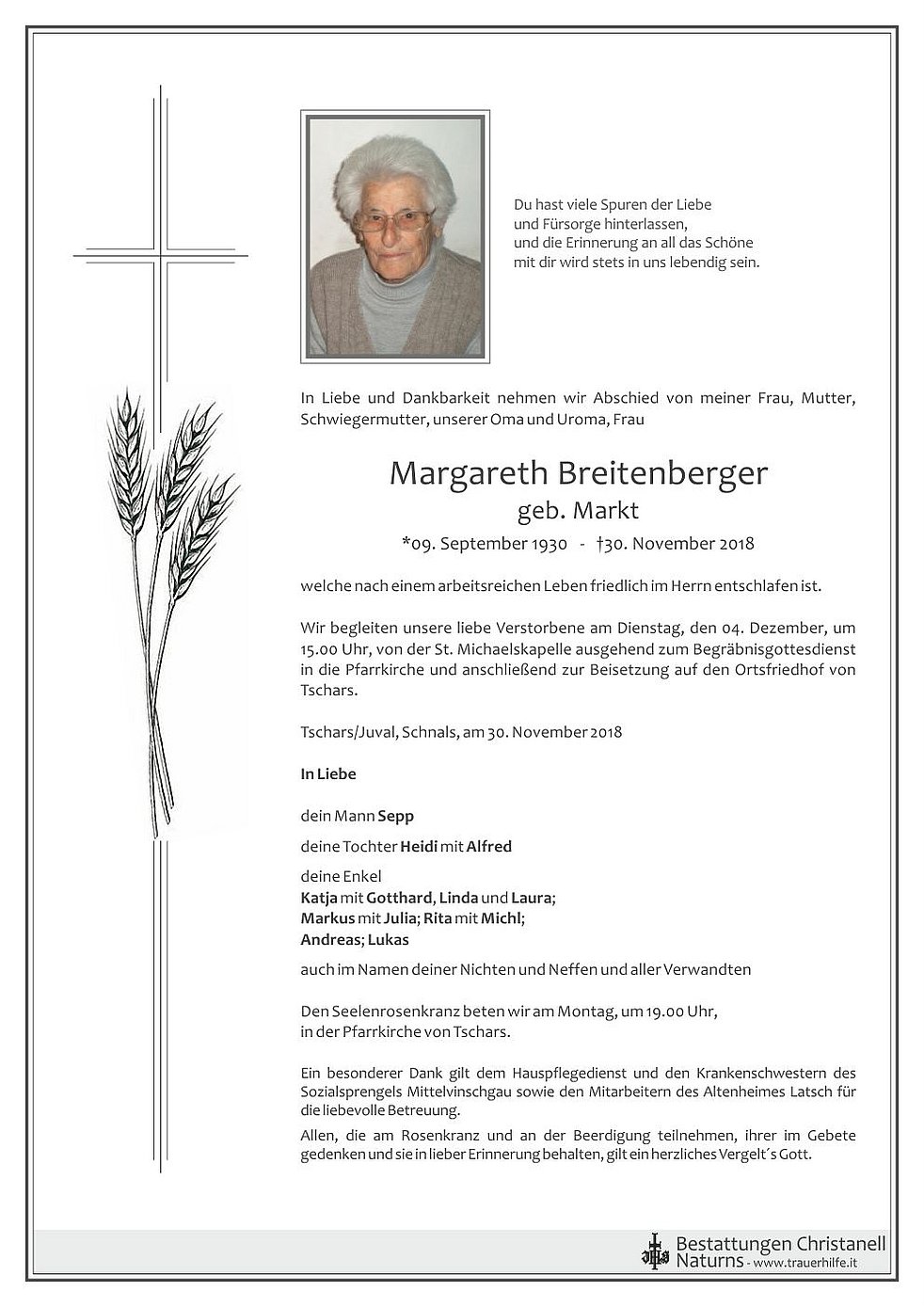 Wir begleiten unsere liebe Verstorbene am Dienstag, den 04. Dezember, um 15.00 Uhr, von der St. Michaelskapelle ausgehend zum Begräbnisgottesdienst in die Pfarrkirche und anschließend zur Beisetzung auf den Ortsfriedhof von Tschars.