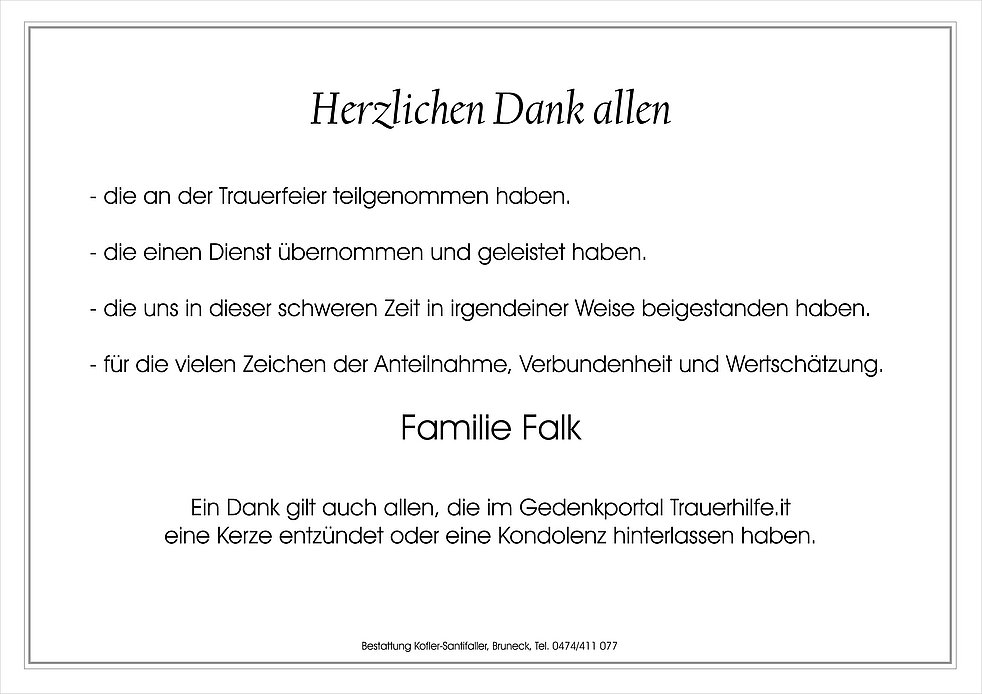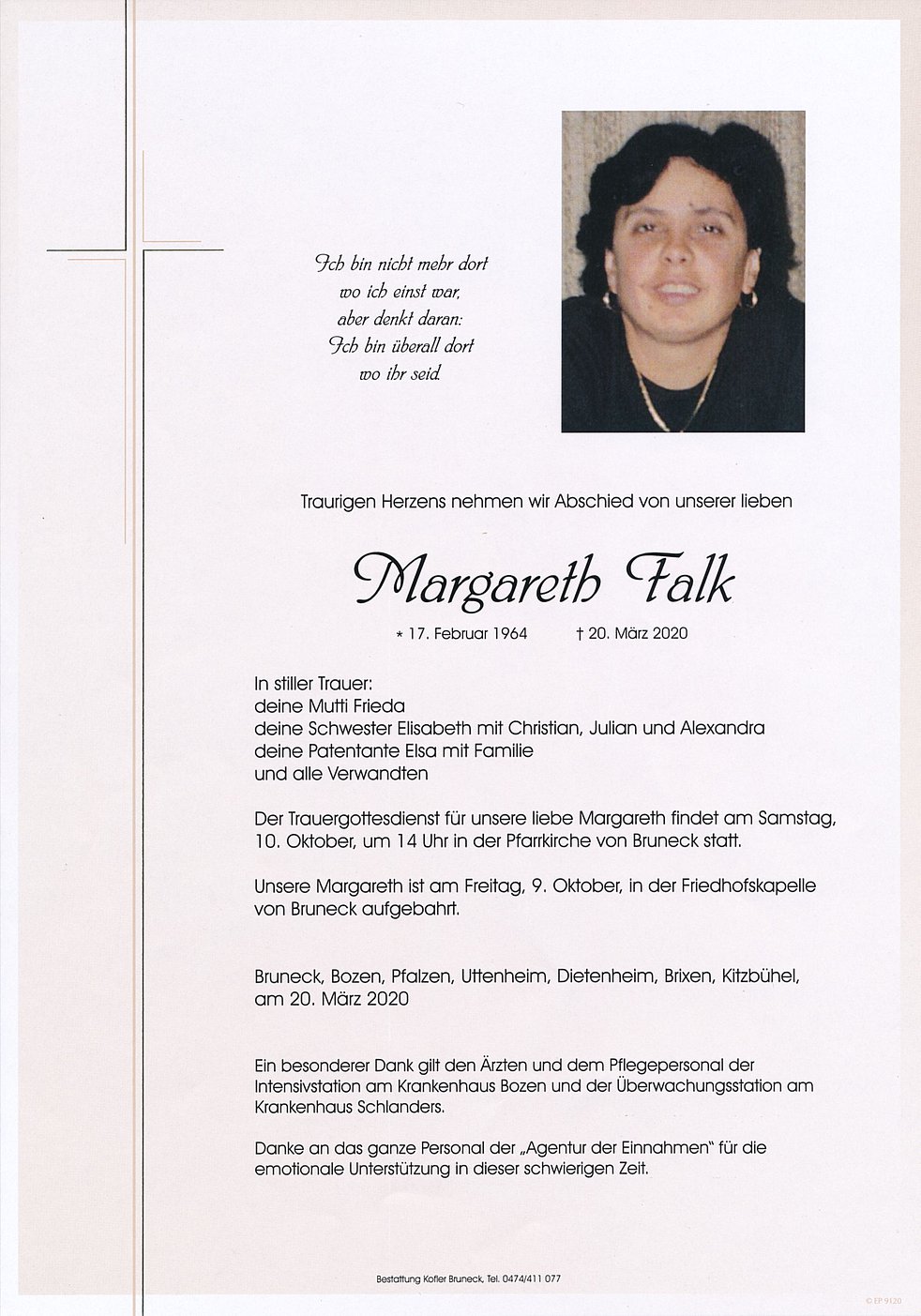 Der Trauergottesdienst für unsere liebe Margareth findet am Samstag, 10. Oktober, um 14 Uhr in der Pfarrkirche von Bruneck statt.