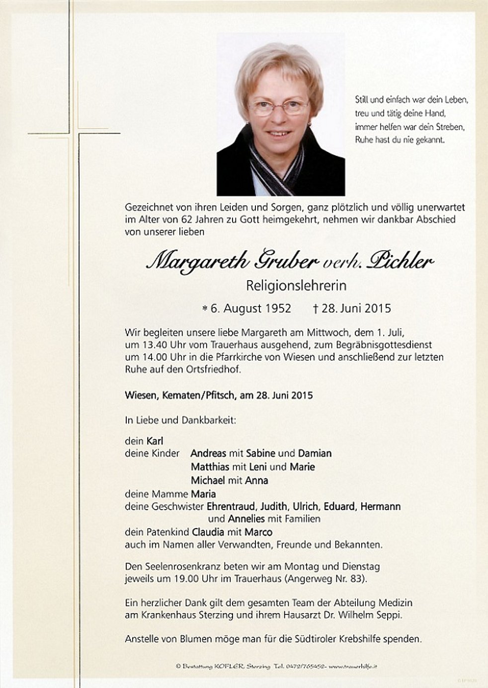 Anstelle von Blumen möge man für die Südtiroler Krebshilfe spenden.