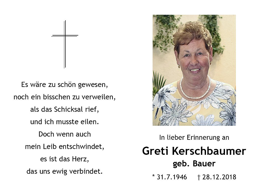 In Liebe und Dankbarkeit nehmen wir Abschied von meiner lieben Frau, unserer guten Mama, Schwiegermutter, Oma, Schwester und Schwägerin, Frau