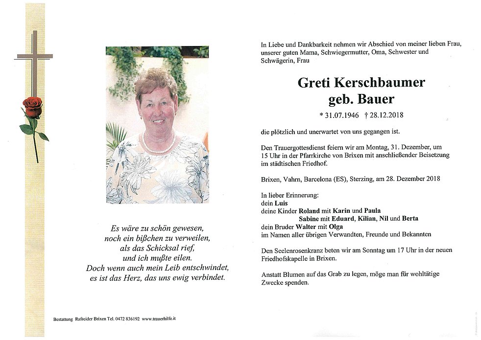 Gedankt sei dem Notarzt, dem Weißen Kreuz und der Ersten Hilfe Station des Krankenhauses Brixen, sowie allen, die am Rosenkranz und an der Beerdigung teilnehmen.