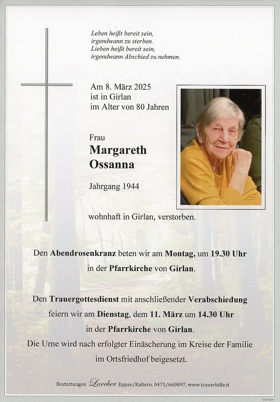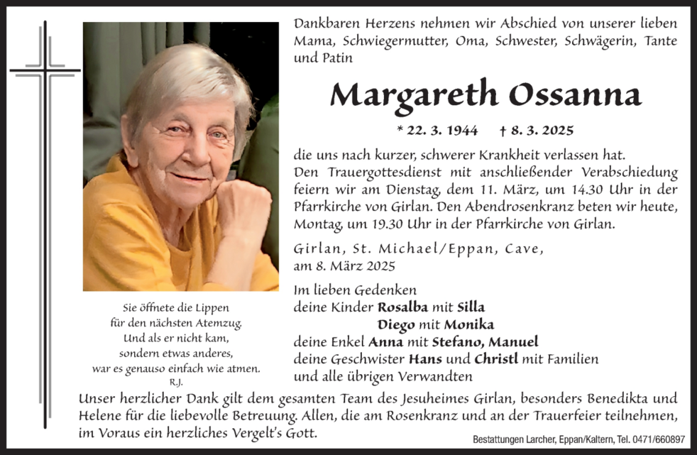 Den Trauergottesdienst mit anschließender Verabschiedung feiern wir am Dienstag, dem 11. März um 14.30 Uhr in der Pfarrkirche von Girlan.