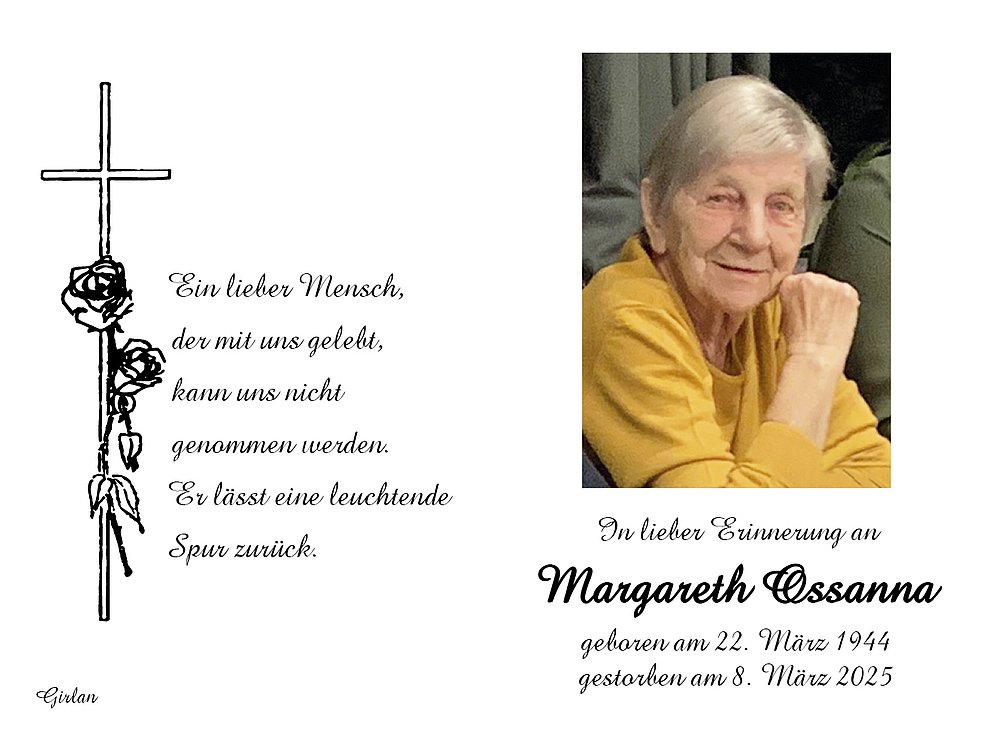 Dankbaren Herzens nehmen wir Abschied von unserer lieben Mama, Schwiegermutter, Oma, Schwester, Schwägerin, Tante und Patin