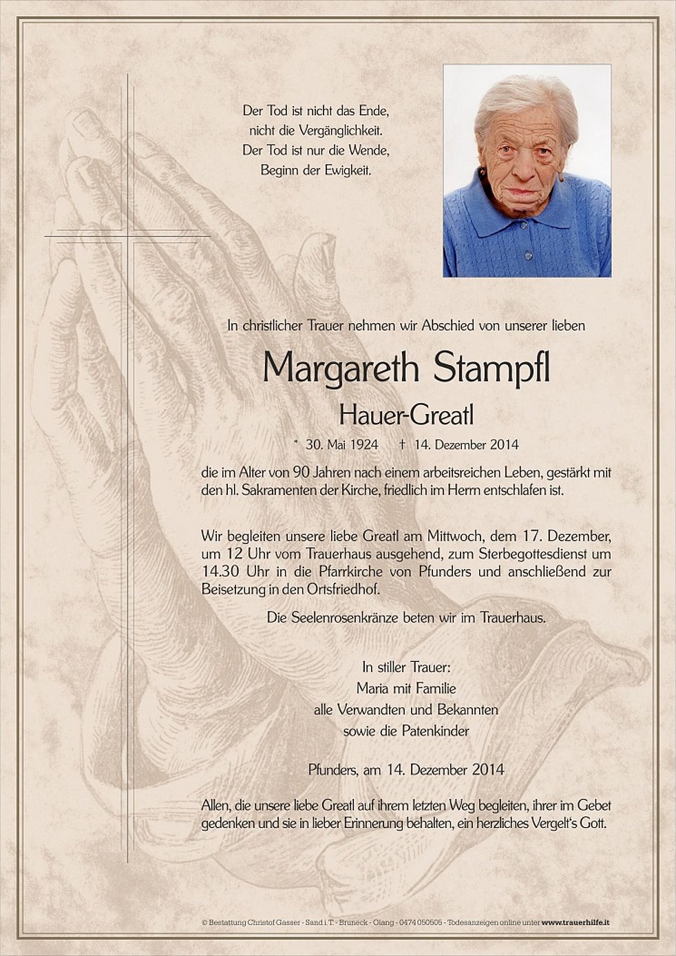 Wir begleiten unsere liebe Greatl am Mittwoch, dem 17. Dezember, um 12 Uhr vom Trauerhaus ausgehend, zum Sterbegottesdienst um 14.30 Uhr in die Pfarrkirche von Pfunders und anschließend zur Beisetzung in den Ortsfriedhof.