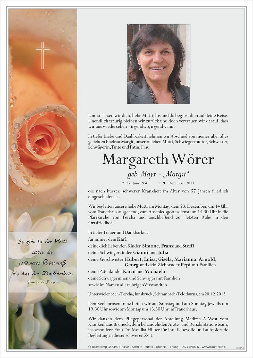 Wir danken dem Pflegepersonal der Abteilung Medizin A West vom Krankenhaus Bruneck, dem behandelnden Ärzte- und Rehabilitationsteam, insbesondere Frau Dr. Monika Hilber für ihre liebevolle und aufopfernde Begleitung in dieser schweren Zeit.