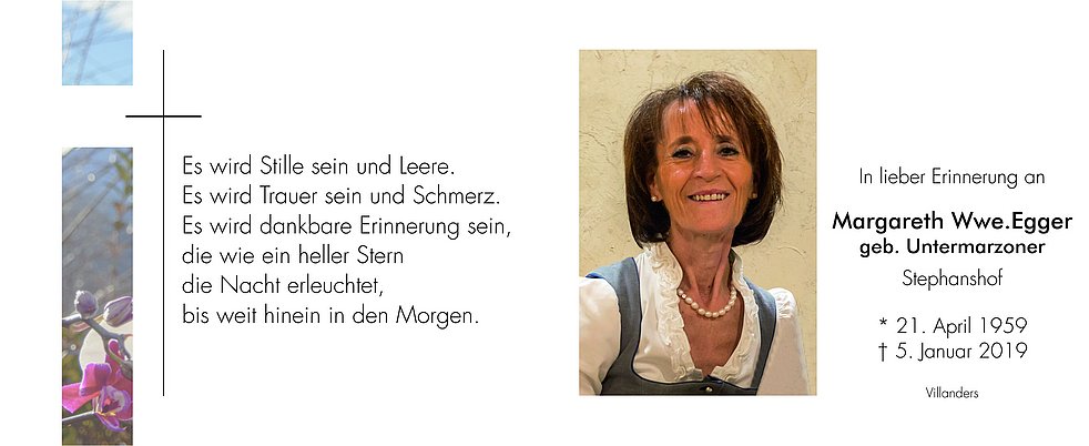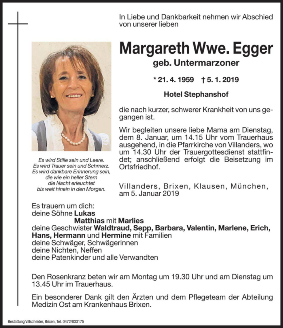Lieber Matthias,lieber Lukas, mit tiefer Betroffenheit haben wir vom Tod eurer lieben Mutter erfahren. Wir trauern und leiden mit euch. Wir haben sie sehr verehrt, gern mit ihr geredet und sie in die Arme geschlossen. Sie war für uns nicht nur in eurem Hotel sondern vor allem auch zutiefst menschlich ein Lichtblick, ein Stern. Nun ist er erloschen und wir sagen: leb' wohl, liebe Margaret. Euch beiden wünschen wir von Herzen, dass ihr den geliebten Stephanshof im Sinne eurer Eltern weiterführen könnt. Gott sei mit euch. Seid beide herzlichst umarmt von Roland und Gitta Roland und Gitta.