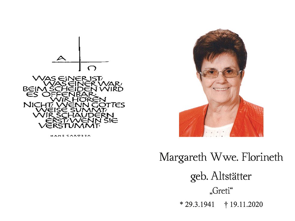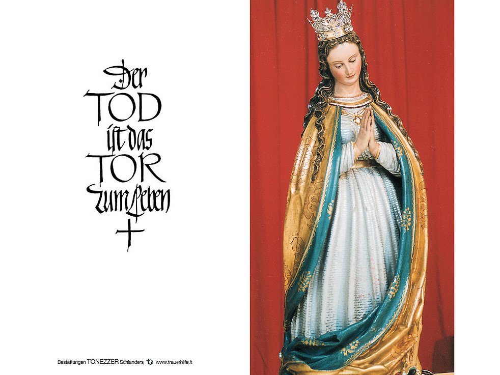 Den Begräbnisgottesdienst für unsere liebe Greti feiern wir am Samstag, 28. November, um 14 Uhr in der Pfarrkirche von Schlanders.