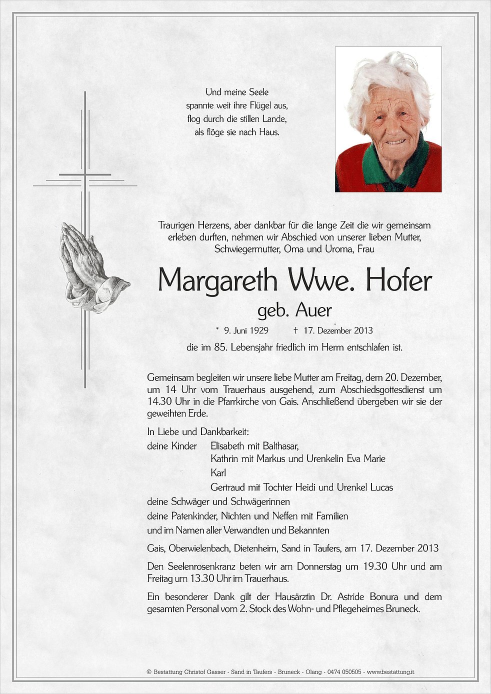Gemeinsam begleiten wir unsere liebe Mutter am Freitag, dem 20. Dezember, um 14 Uhr vom Trauerhaus ausgehend, zum Abschiedsgottesdienst um 14.30 Uhr in die Pfarrkirche von Gais. Anschließend übergeben wir sie der geweihten Erde.