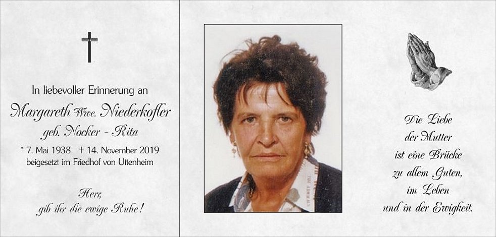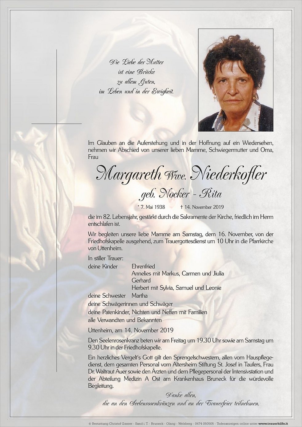 Wir begleiten unsere liebe Mamme am Samstag, dem 16. November, von der Friedhofskapelle ausgehend, zum Trauergottesdienst um 10 Uhr in die Pfarrkirche von Uttenheim.