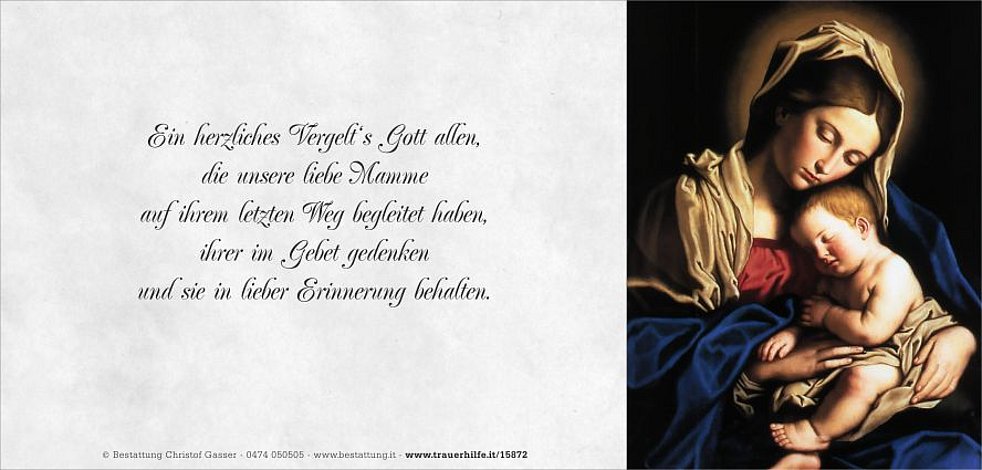 Ein herzliches Vergelt‘s Gott gilt den Sprengelschwestern, allen vom Hauspflegedienst, dem gesamten Personal vom Altersheim Stiftung St. Josef in Taufers, Frau Dr. Waltraut Auer sowie den Ärzten und dem Pflegepersonal der Intensivstation und der Abteilung Medizin A Ost am Krankenhaus Bruneck für die würdevolle Begleitung.