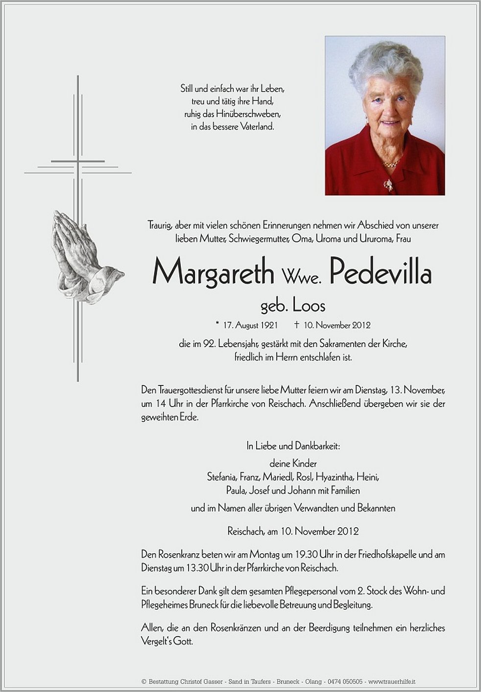Den Trauergottesdienst für unsere liebe Mutter feiern wir am Dienstag, 13. November, um 14 Uhr in der Pfarrkirche von Reischach. Anschließend übergeben wir sie der geweihten Erde.