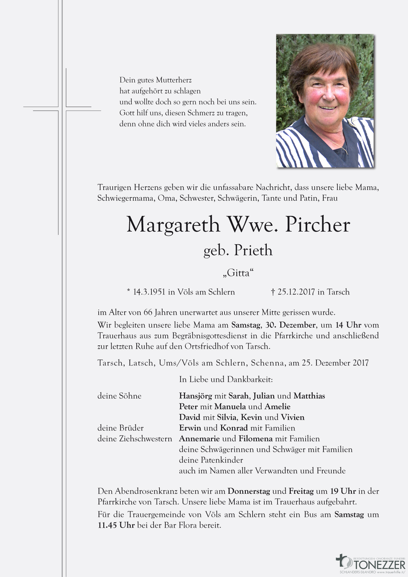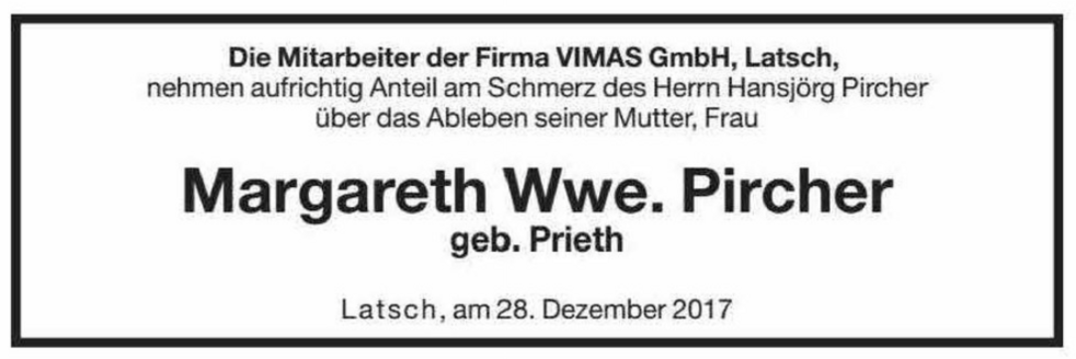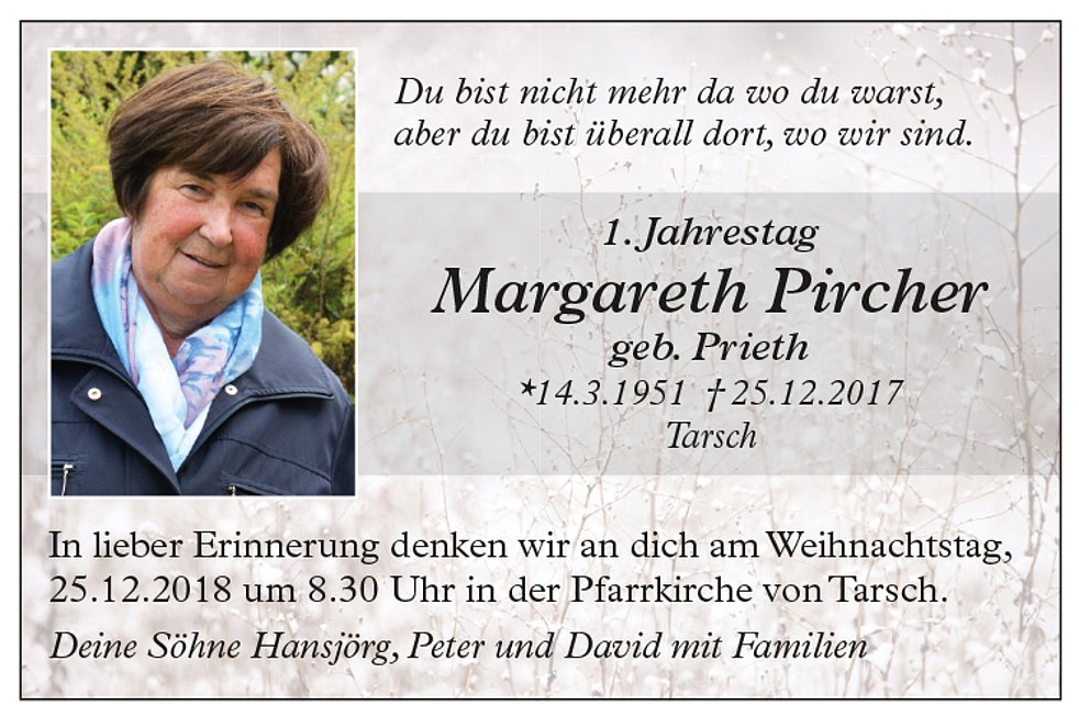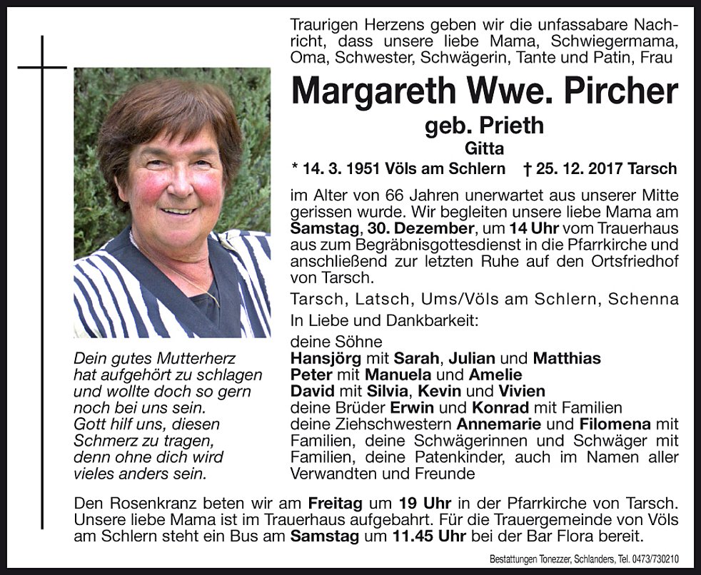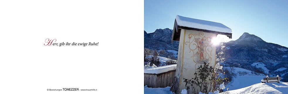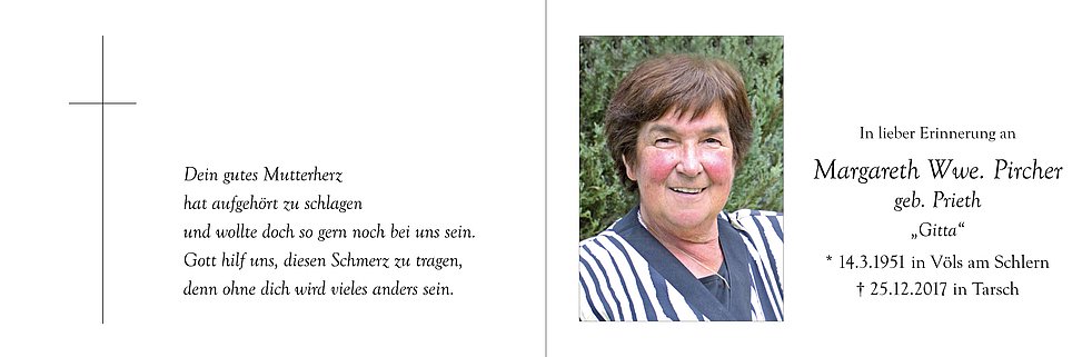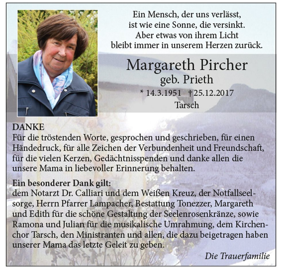 Wir begleiten unsere liebe Mama am Samstag, 30. Dezember, um 14 Uhr vom Trauerhaus aus zum Begräbnisgottesdienst in die Pfarrkirche und anschließend zur letzten Ruhe auf den Ortsfriedhof von Tarsch.