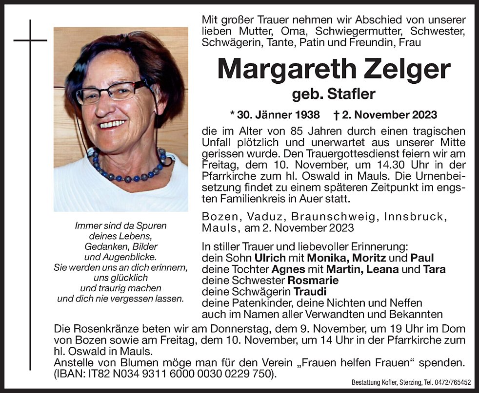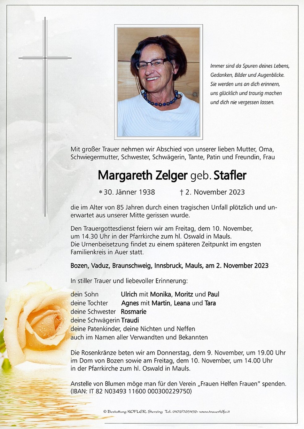 Anstelle von Blumen möge man für den Verein „Frauen helfen Frauen“ spenden. (IBAN: IT 82 N03493 11600 000300229750)