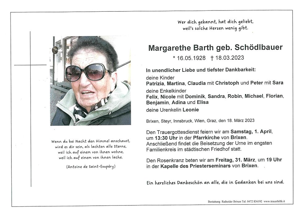Den Trauergottesdienst feiern wir am Samstag, 1. April, um 13:30 Uhr in der Pfarrkirche von Brixen.