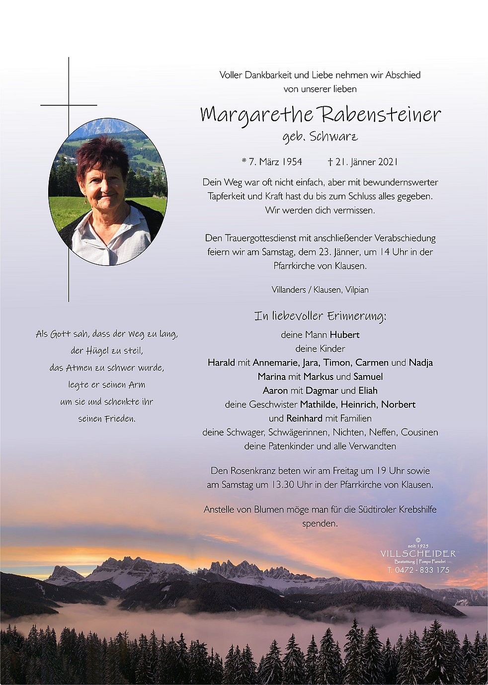 Das kostbarste Vermächtnis eines Menschen ist die Spur, die seine Liebe in unseren Herzen zurückgelassen hat. Herzlichstes Beileid, Hubert, Harald, Marina und Aaron mit Familien. Gute Reise Margit , danke für deine Freundschaft